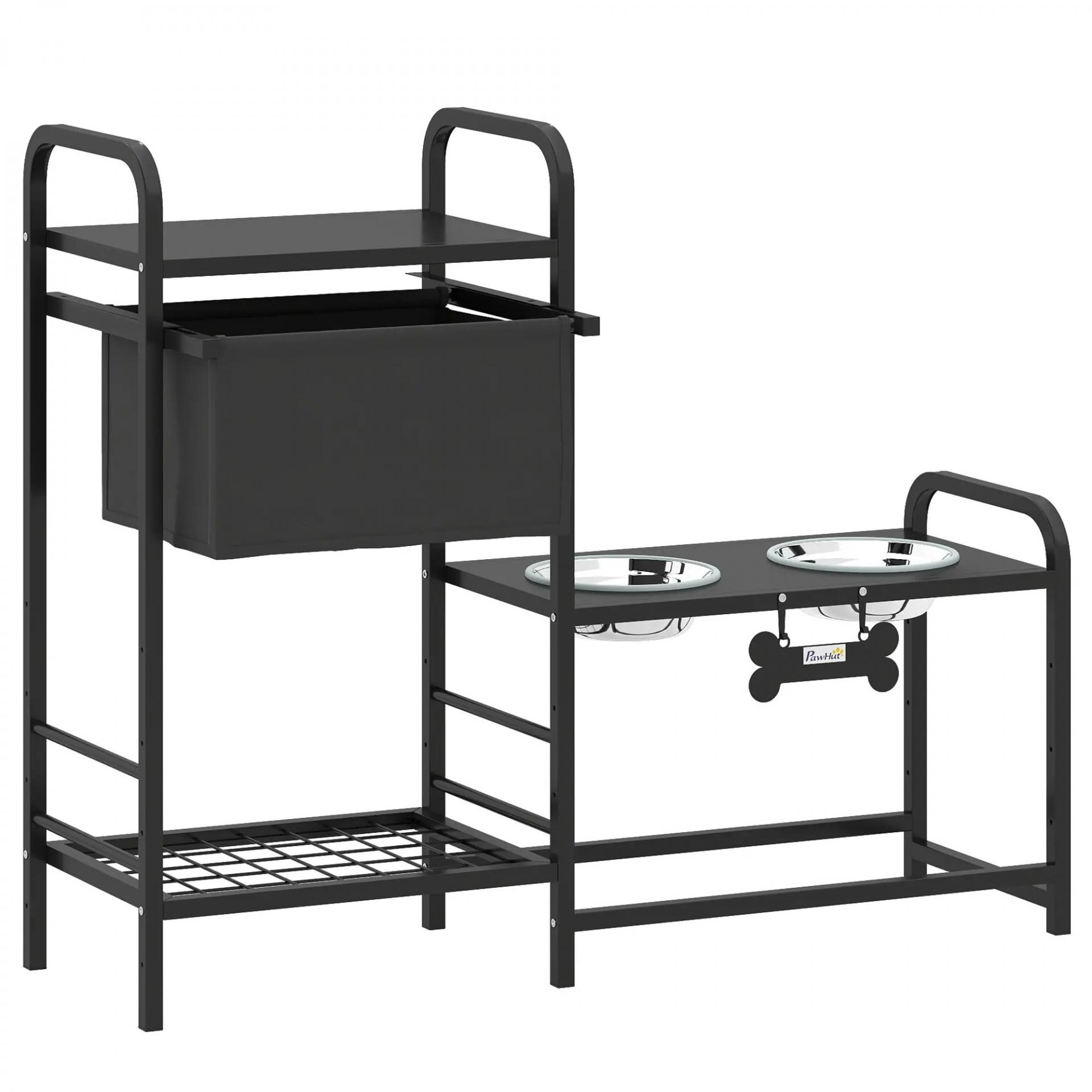 Comedero Perro Elevado con Cajón de Tela 2 Cuencos de Acero Inoxidable 2x800 ml Altura Ajustable 2 Estantes Negro