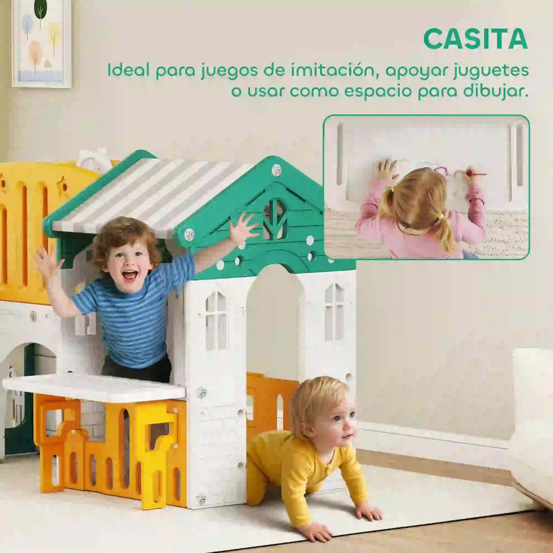 - DIVERSIÓN Y CREATIVIDAD: El parque de juegos infantil combina tobogán para niños y pared de escalada para fomentar la actividad física, mientras que el telescopio, el túnel y la casita con pizarra estimulan la imaginación, la curiosidad y el juego simbólico