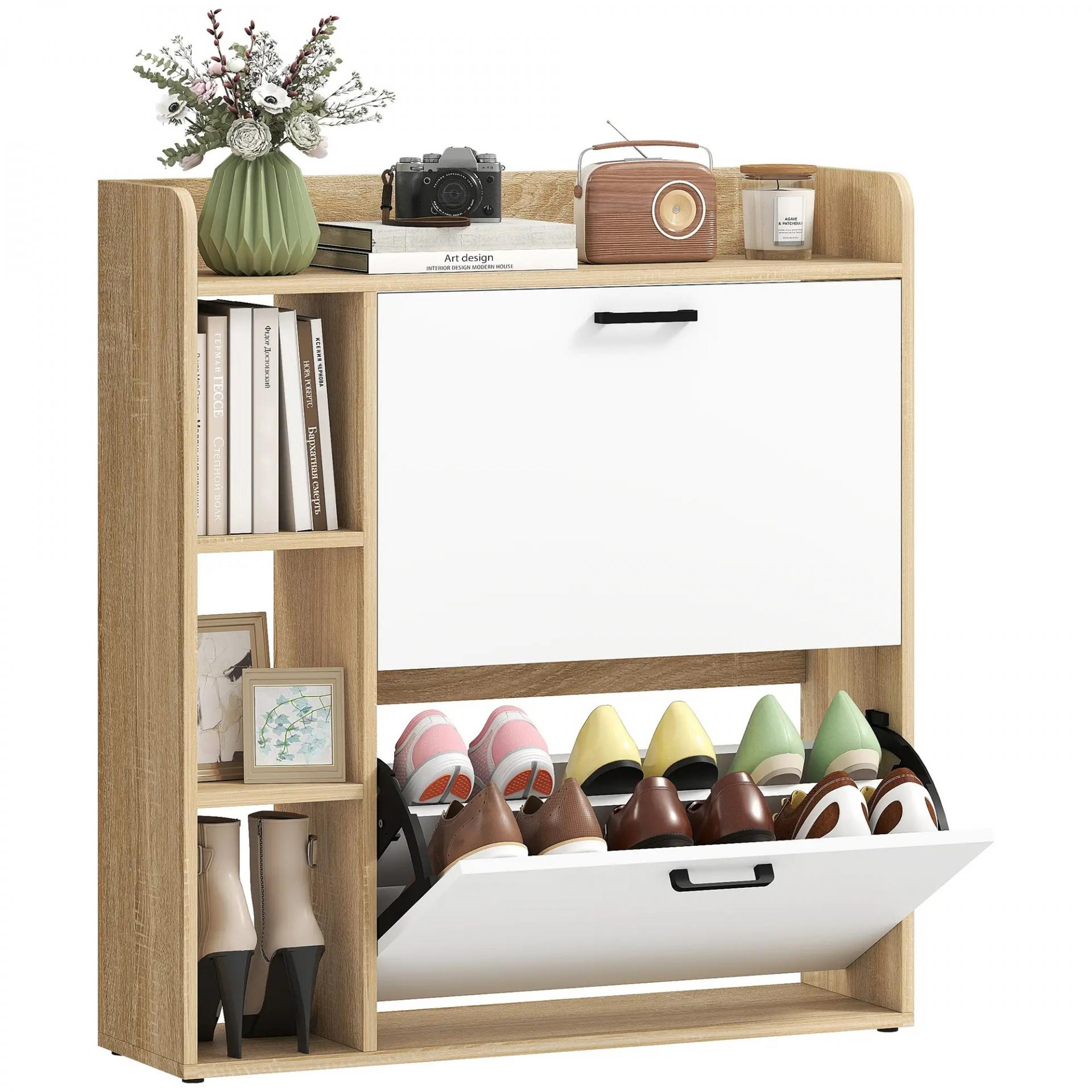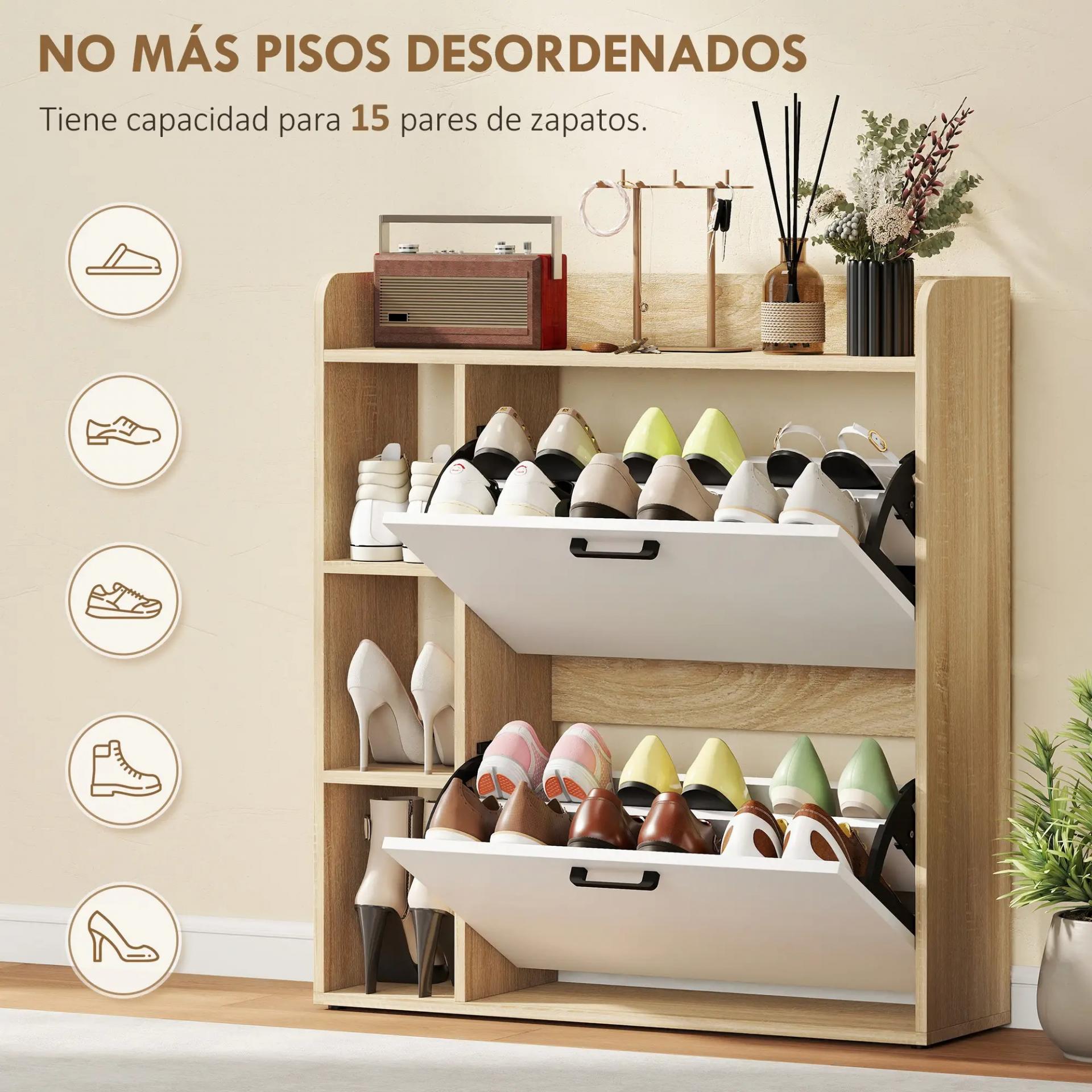 MUEBLE PARA ZAPATOS TODO EN UNO: Este zapatero de HOMCOM combina dos compartimentos abatibles y tres estantes laterales con una amplia superficie superior, permitiendo organizar hasta 15 pares de zapatos, incluyendo zapatillas y botas altas