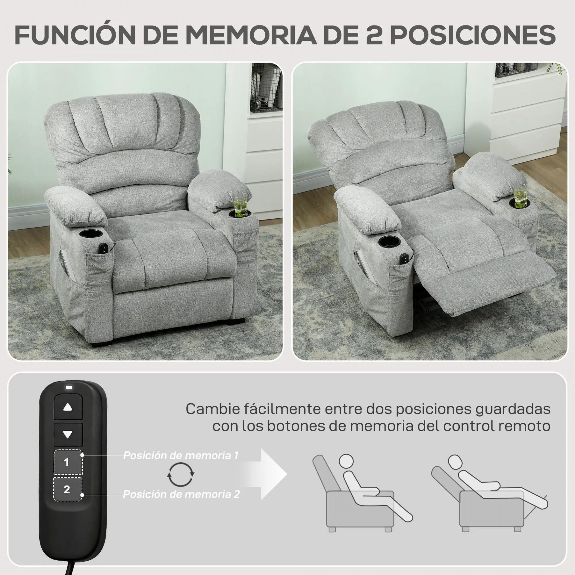 Sillón Relax Reclinable Eléctrico Silencioso con Función Memoria Reposapiés Mando a Distancia Bolsillo Lateral Gris