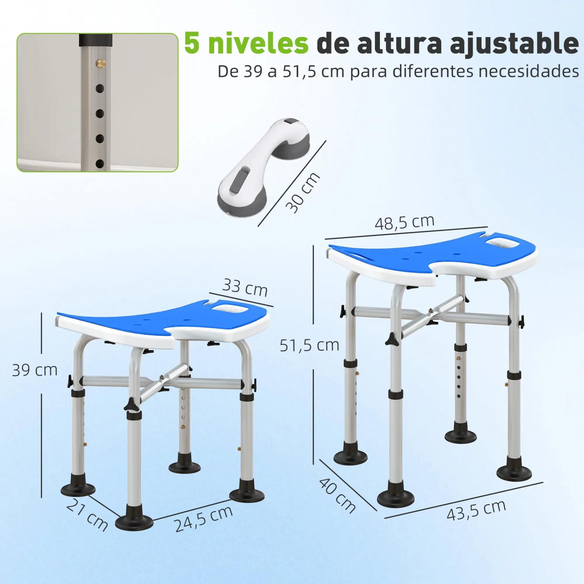 Silla de Ducha Antideslizante con Barra de Agarre con Ventosas Altura Regulable y Asiento en Forma de U Azul