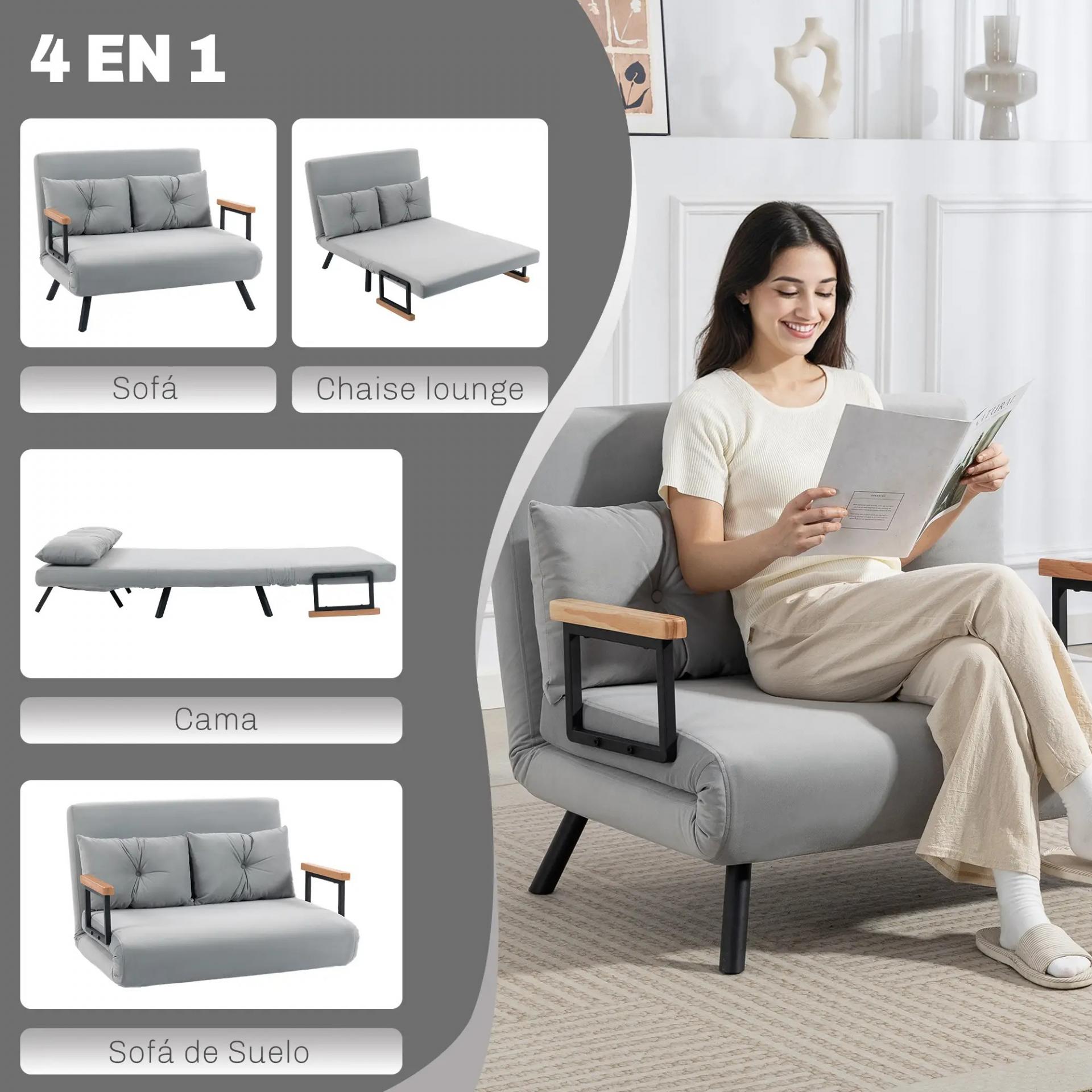 Sofá Cama Convertible 4 en 1 Sofá Cama 2 Plazas Plegable Respaldo Ajustable de 5 Niveles Almohadas 102x73x81cm Gris