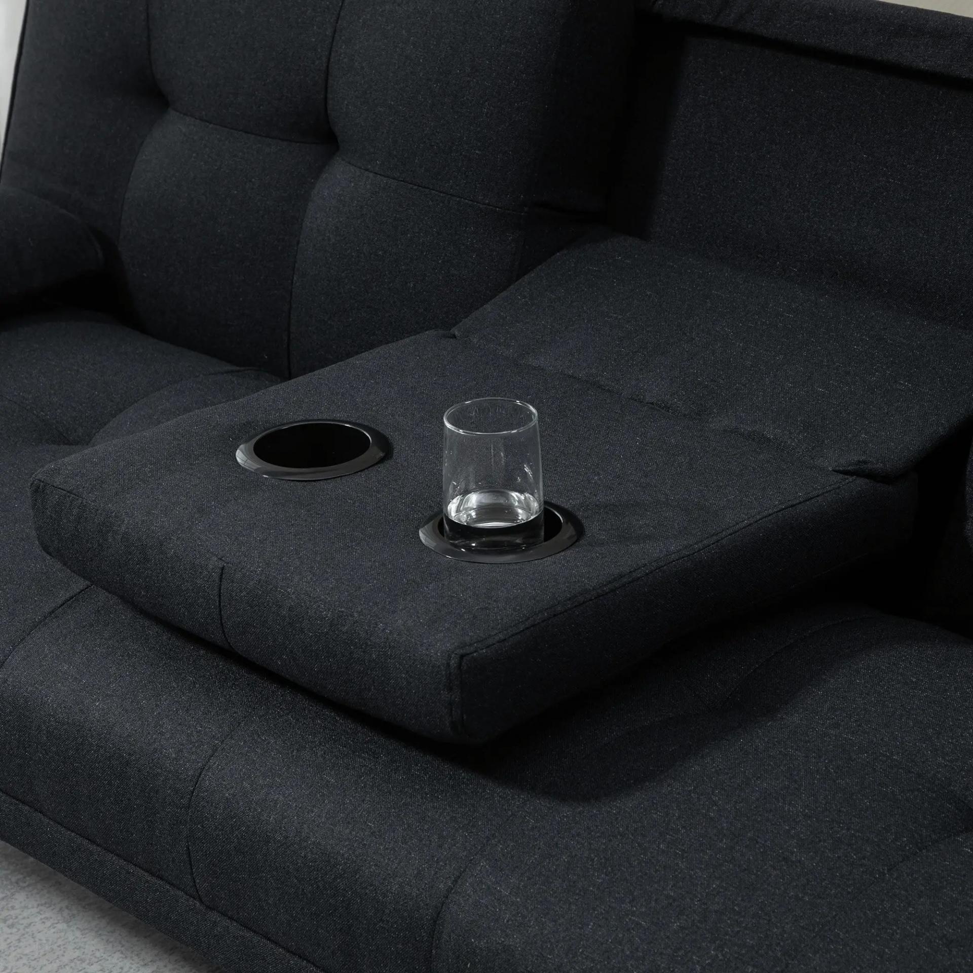 - MESA OCULTA: El respaldo central incluye una práctica bandeja abatible con dos portavasos, perfecta para bebidas o aperitivos sin manchar el sofá