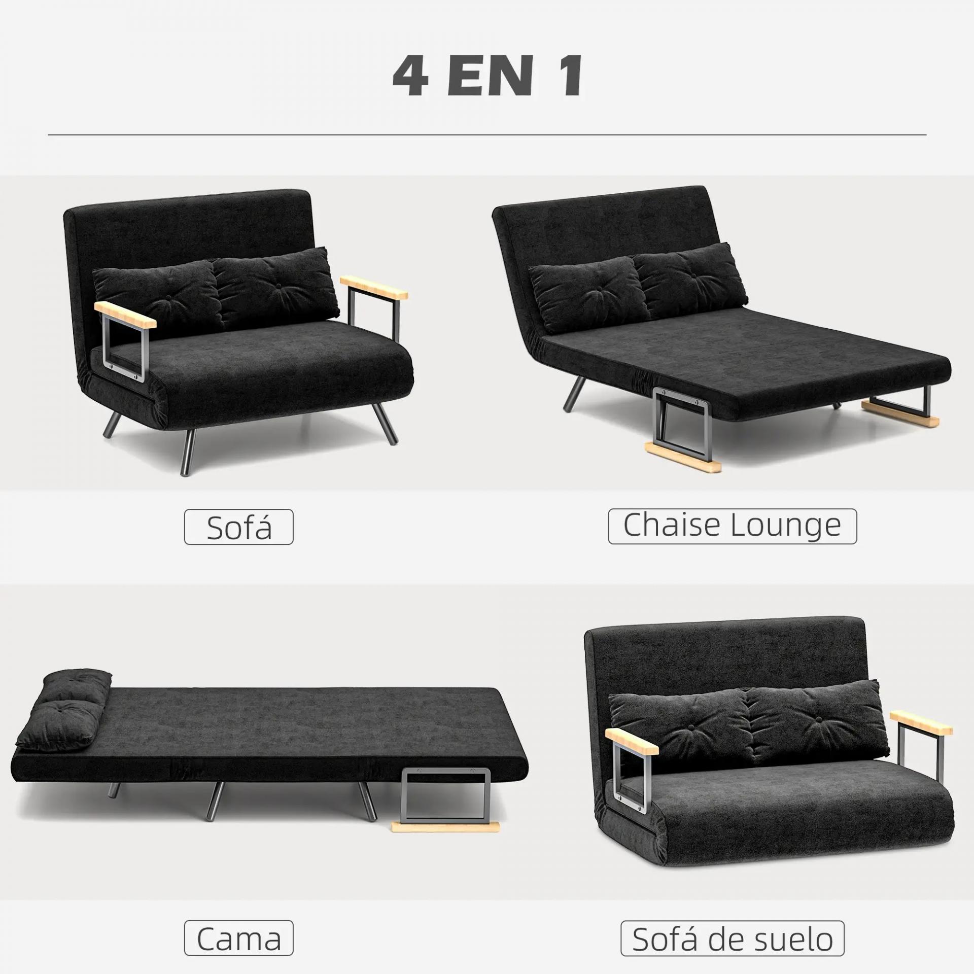Sofá Cama Convertible 4 en 1 Sillón Cama 2 Plazas Plegable Respaldo Ajustable de 5 Niveles Almohadas 102x73x81cm Negro