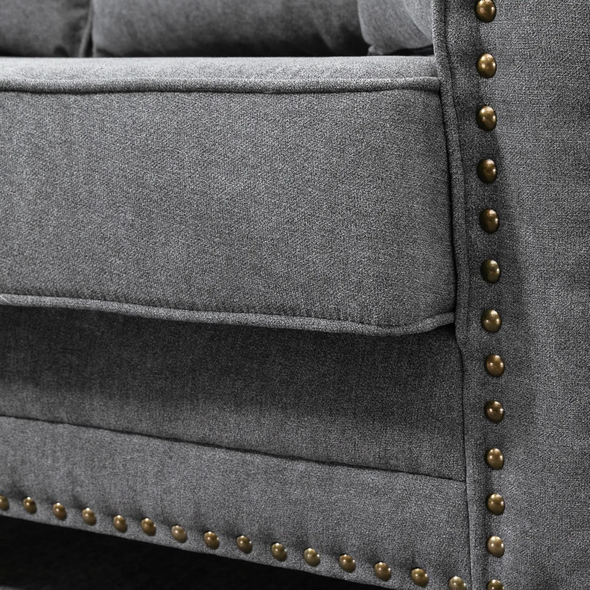 Sofá de 3 Plazas con Tachuelas Oro Envejecido Tapizado en Poliéster con 2 Cojines Decorativos 196x80,5x89 cm Gris