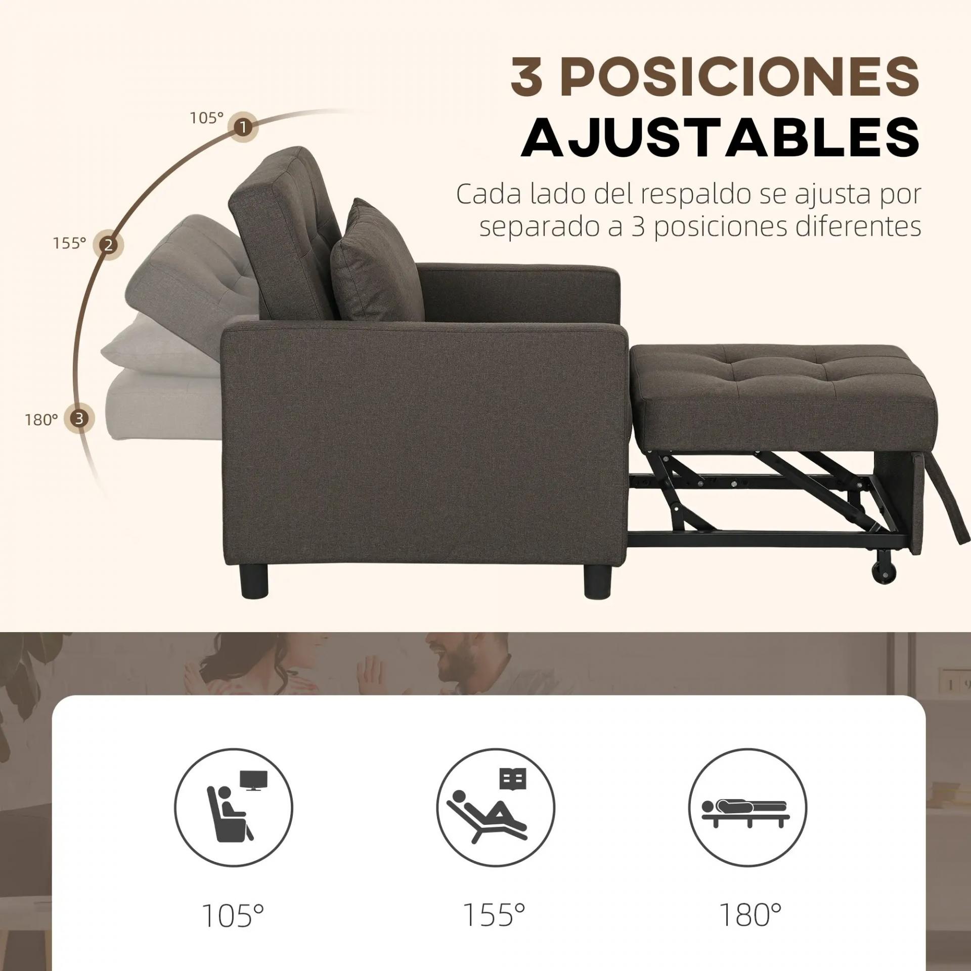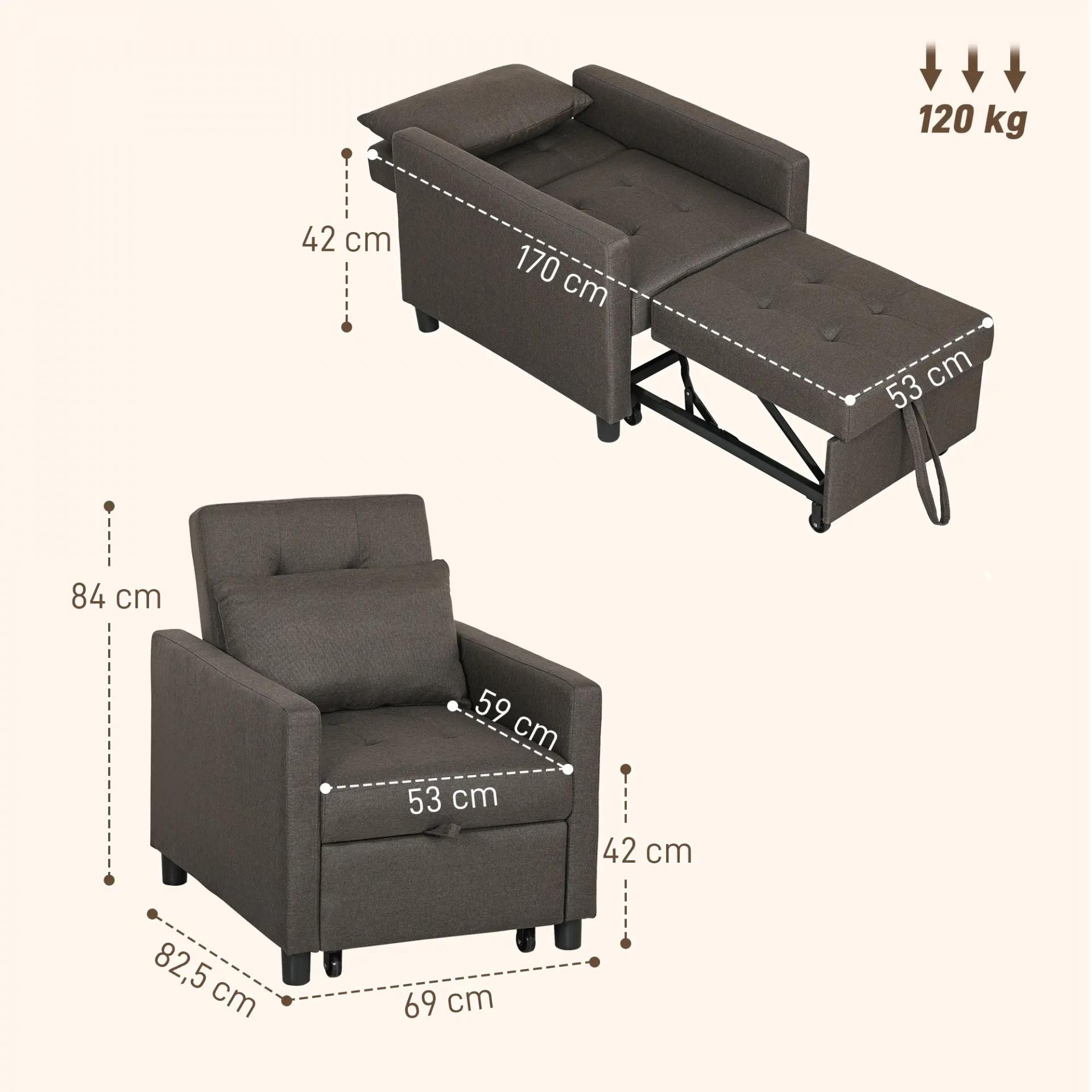 Sofá Cama de 1 Plaza Tapizado en Lino con Respaldo Ajustable de 3 Niveles y Almohada Acolchada 69x82,5x84 cm Marrón