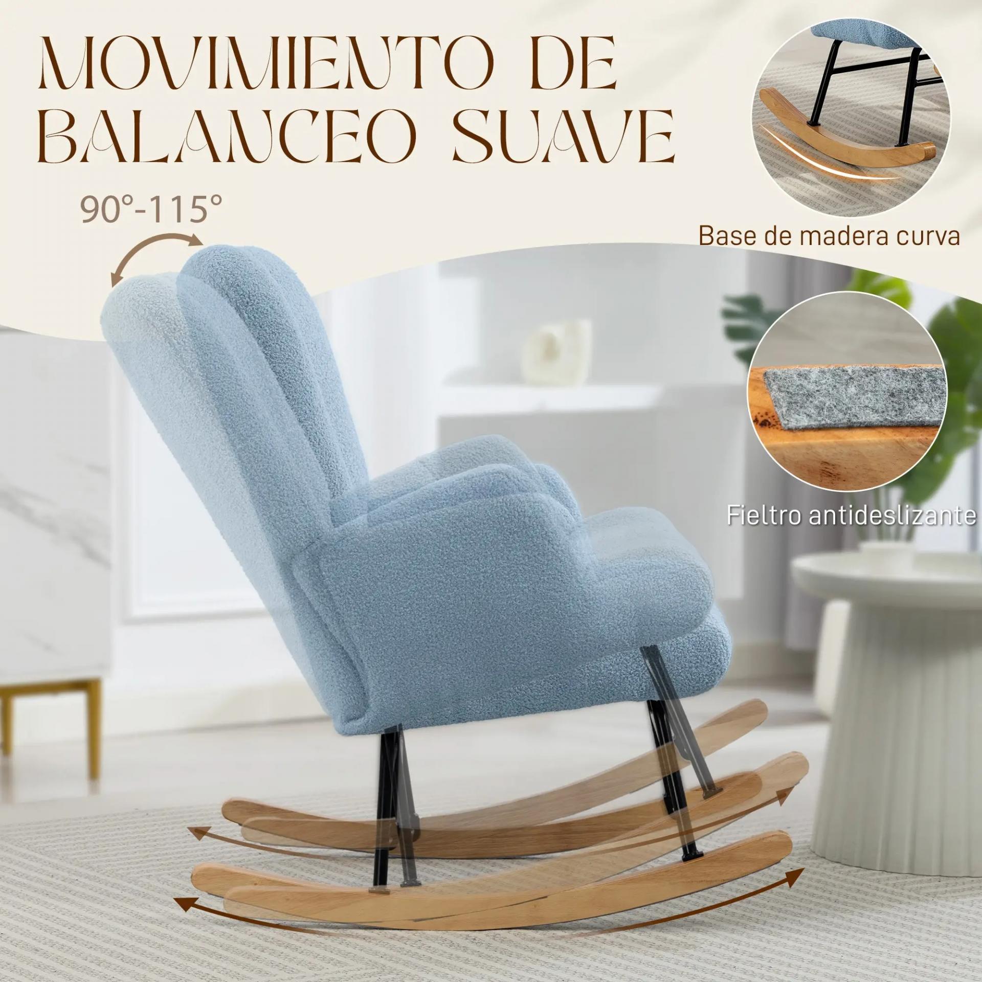 Silla Mecedora de Terciopelo de Teddy con Respaldo Alto Patas de Madera de Caucho Reposabrazos Azul Claro