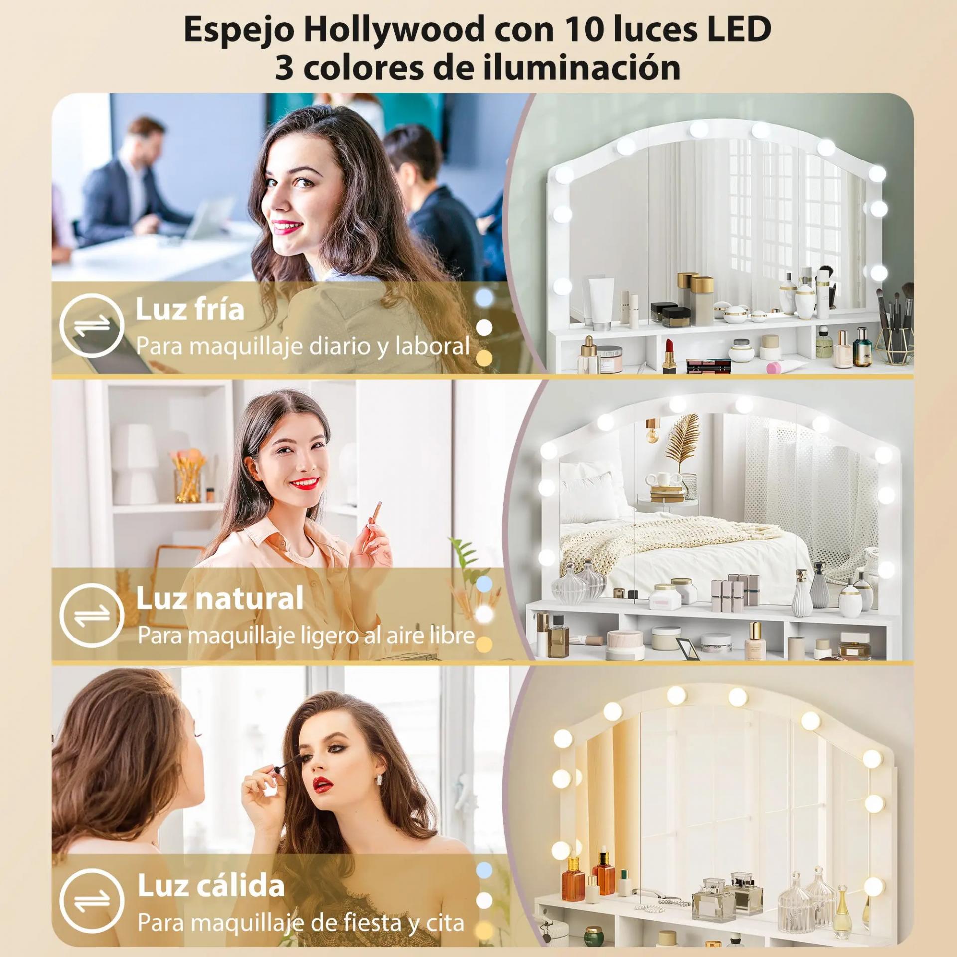 ESPEJO CON ILUMINACIÓN AJUSTABLE: Este tocador de maquillaje de HOMCOM incluye un espejo con 10 bombillas LED estilo Hollywood y tres tonos de luz (fría, natural y cálida). Ideal para crear el ambiente perfecto a cualquier hora del día o la noche