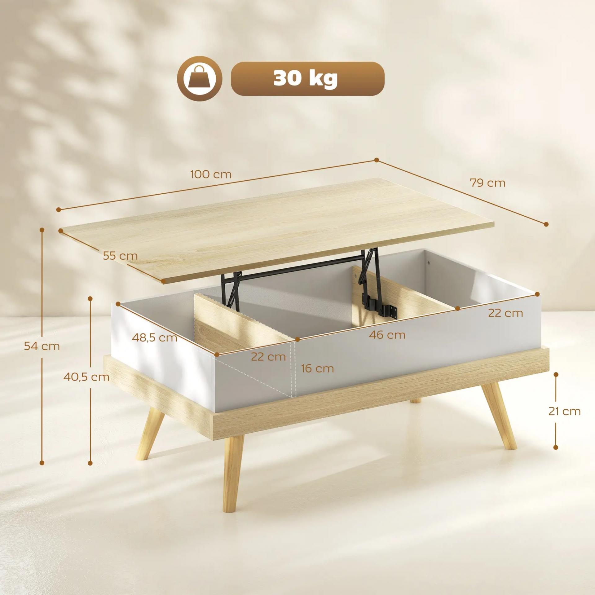 Mesa de Centro Elevable con 3 Compartimientos de Almacenaje Ocultos y Patas de Madera 100x79x54 cm Natural y Blanco
