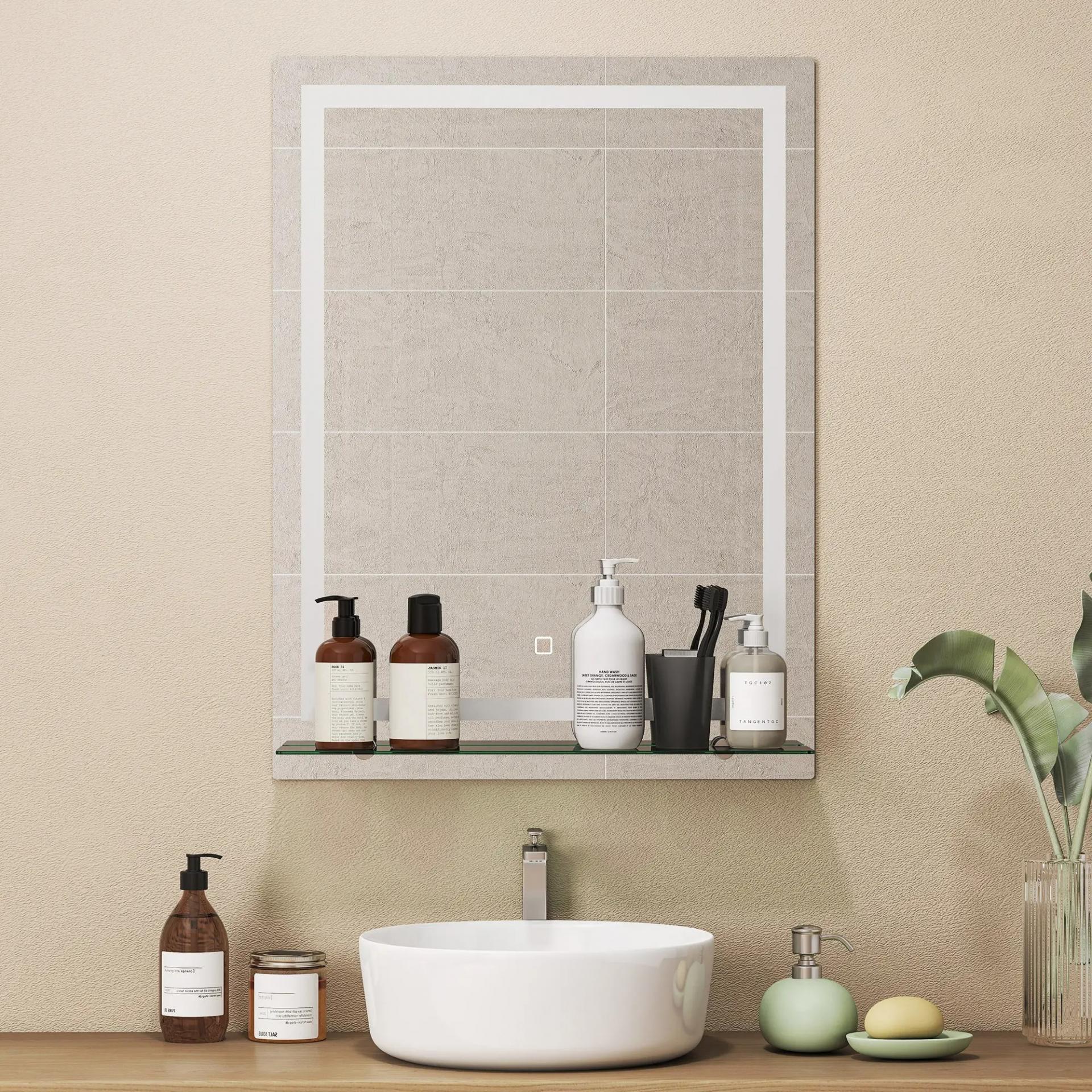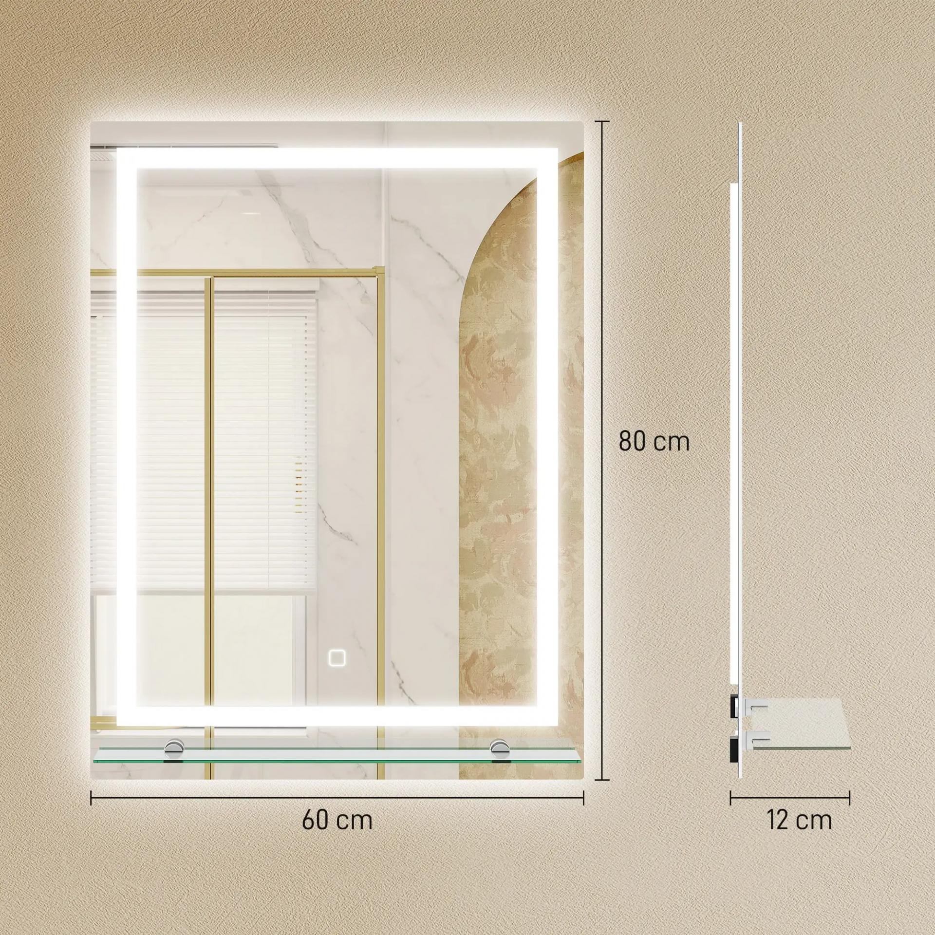 Espejo para Baño 60x80 cm con 3 Colores de Luz Estante de Vidrio Función de Memoria e Interruptor Táctil Plata