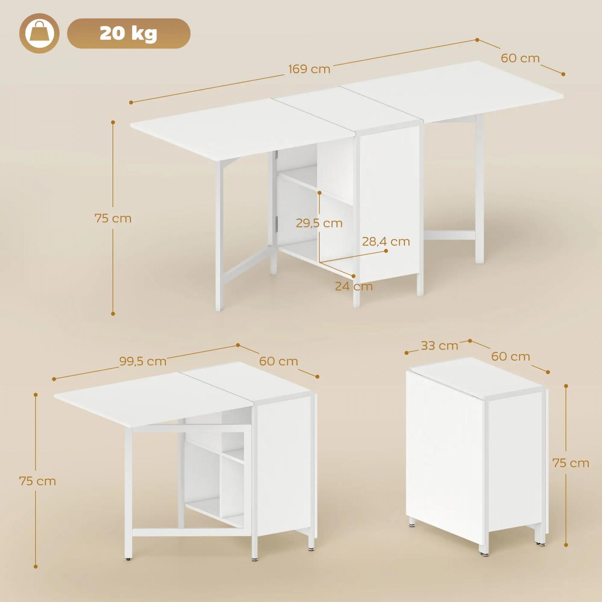 Mesa Plegable de Comedor con Alas Abatibles 4 Compartimentos 3 Formas para Cocina Salón 169x60x75 cm Blanco