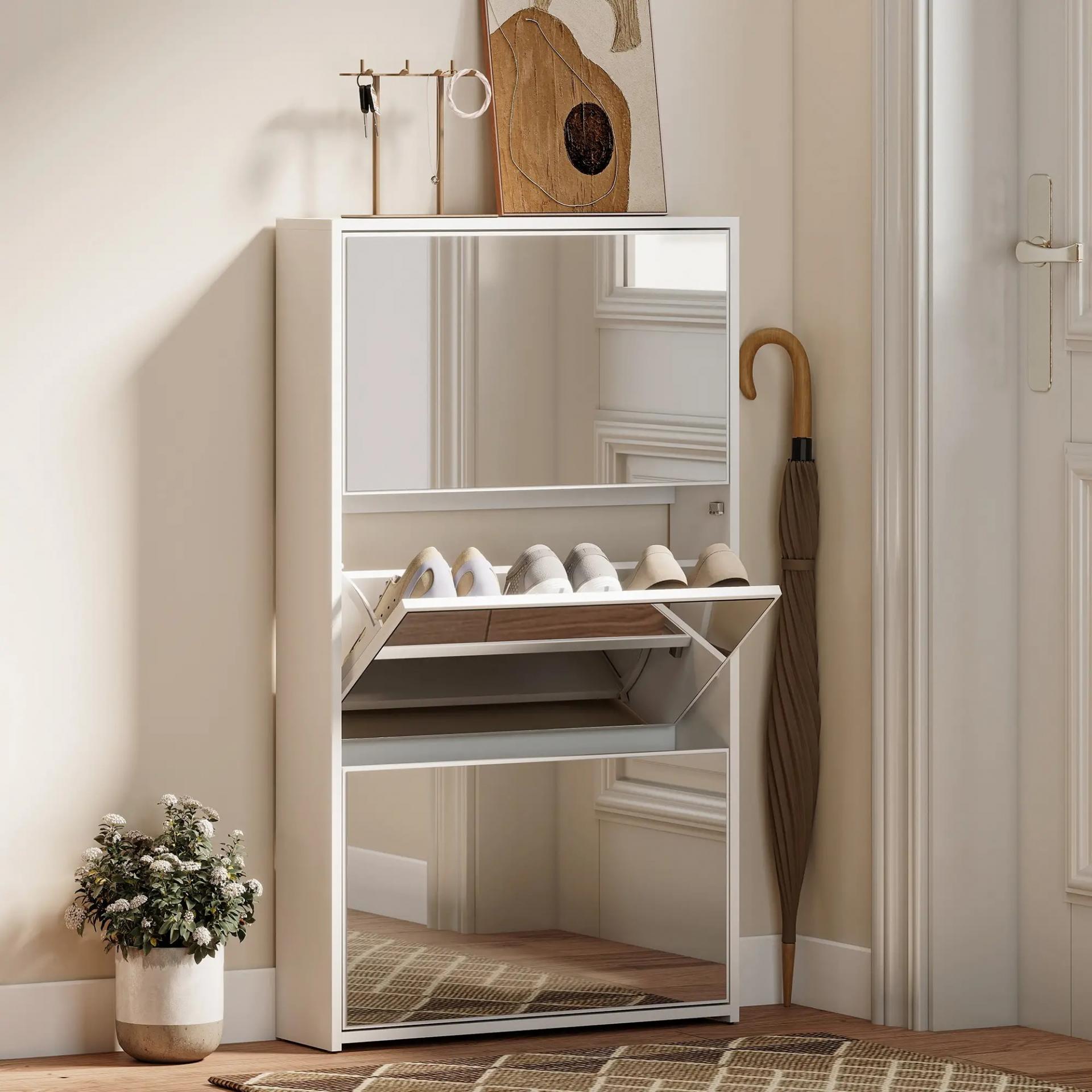 - PUERTAS CON ESPEJO: Las puertas con espejo de este zapatero estrecho permiten ver los zapatos cómodamente y revisar tu imagen antes de salir. Su diseño moderno aporta luminosidad y sensación de amplitud en cualquier estancia