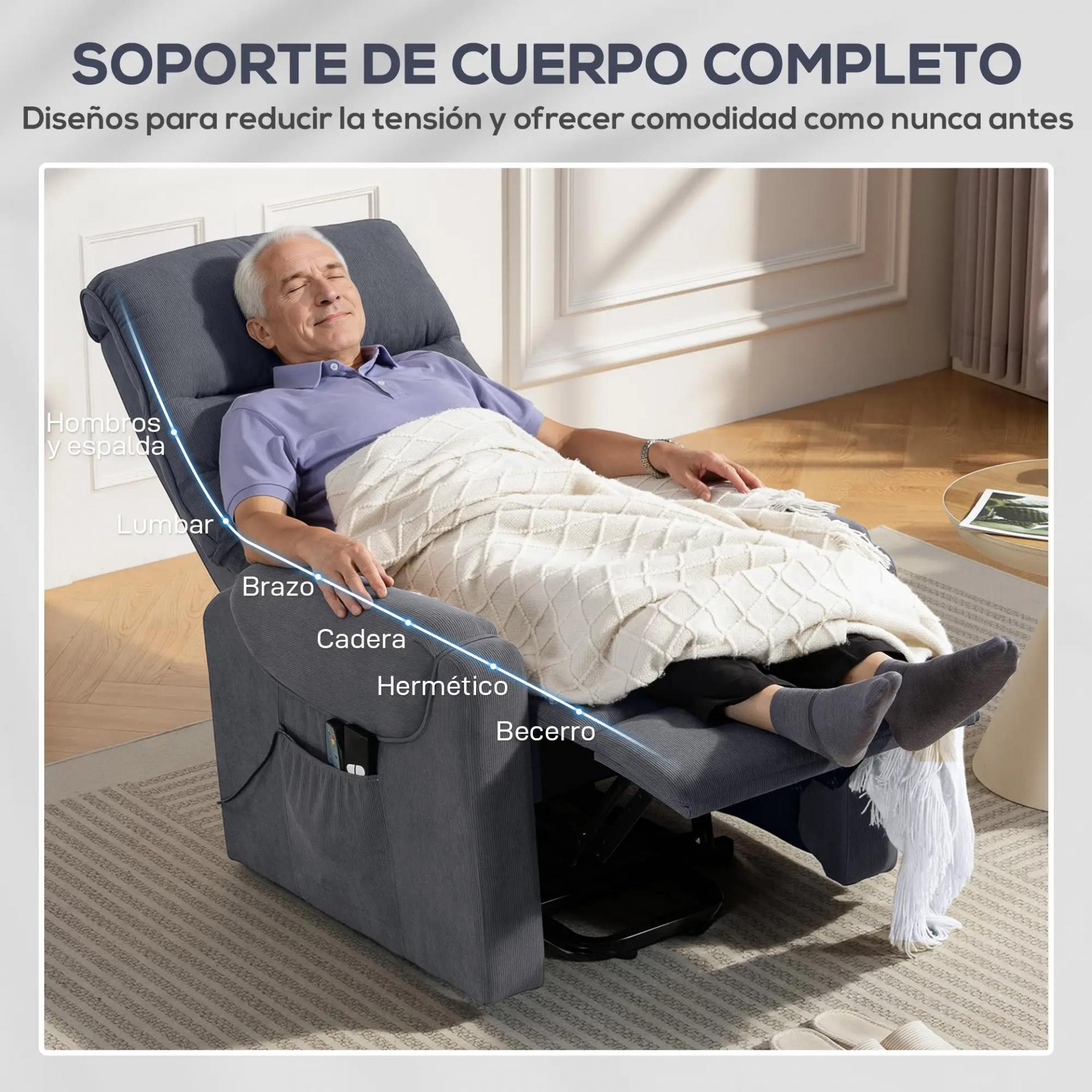 - MASAJE POR VIBRACIÓN: Además de su función elevadora, el sillón relax reclinable incluye masaje con 8 puntos de vibración para aliviar dolor y tensión muscular y mejorar la circulación en espalda, zona lumbar y piernas. Ideal para relajar el cuerpo tras un largo día