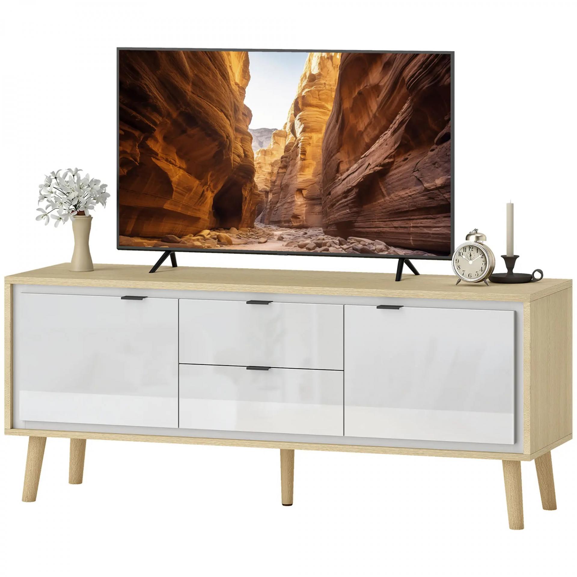- ESTILO MODERNO Y ELEGANTE: Este mueble de TV tiene puertas en blanco alto brillo y una estructura con efecto madera de roble, que se adapta perfectamente a cualquier decoración moderna. Soporta televisores de hasta 55 pulgadas