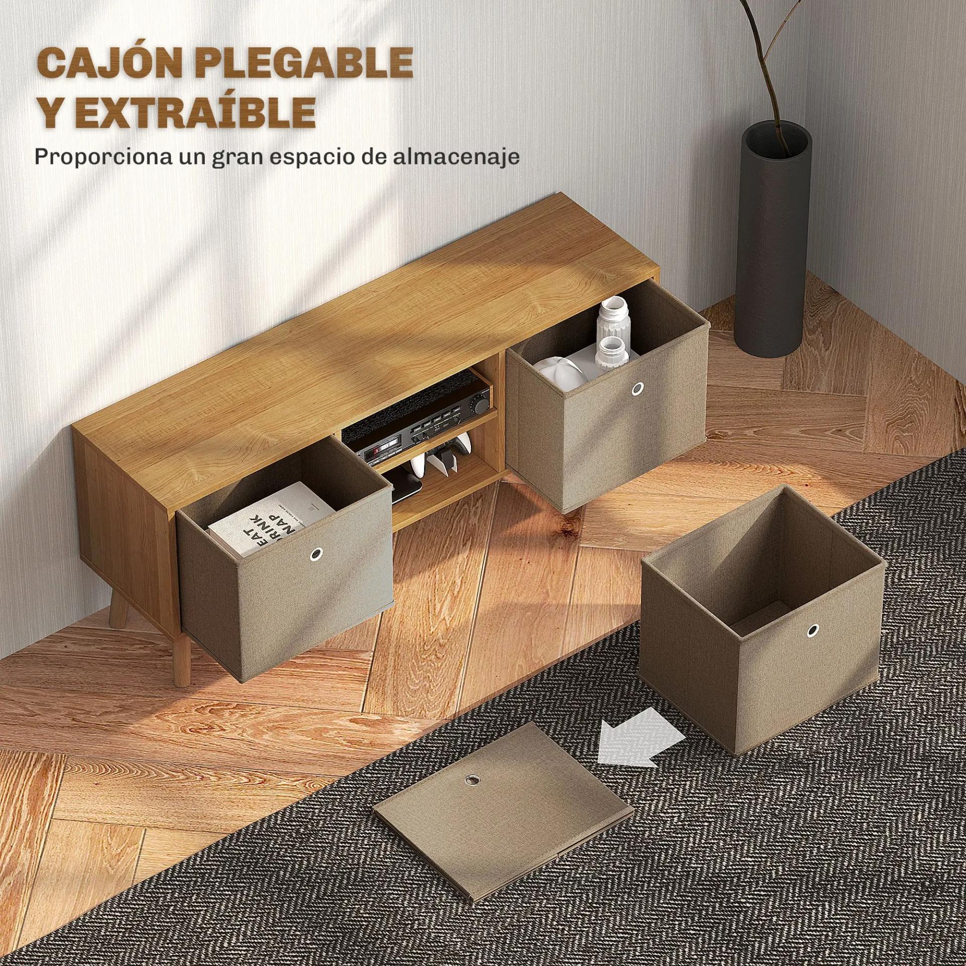 - CAJONES PLEGABLES: Este mueble de TV para salón tiene 2 cajones de tejido non-woven plegables que puedes poner y sacar fácilmente según tus necesidades de uso. Al sacarlos, obtendrá un mueble completamente abierto con 4 compartimentos