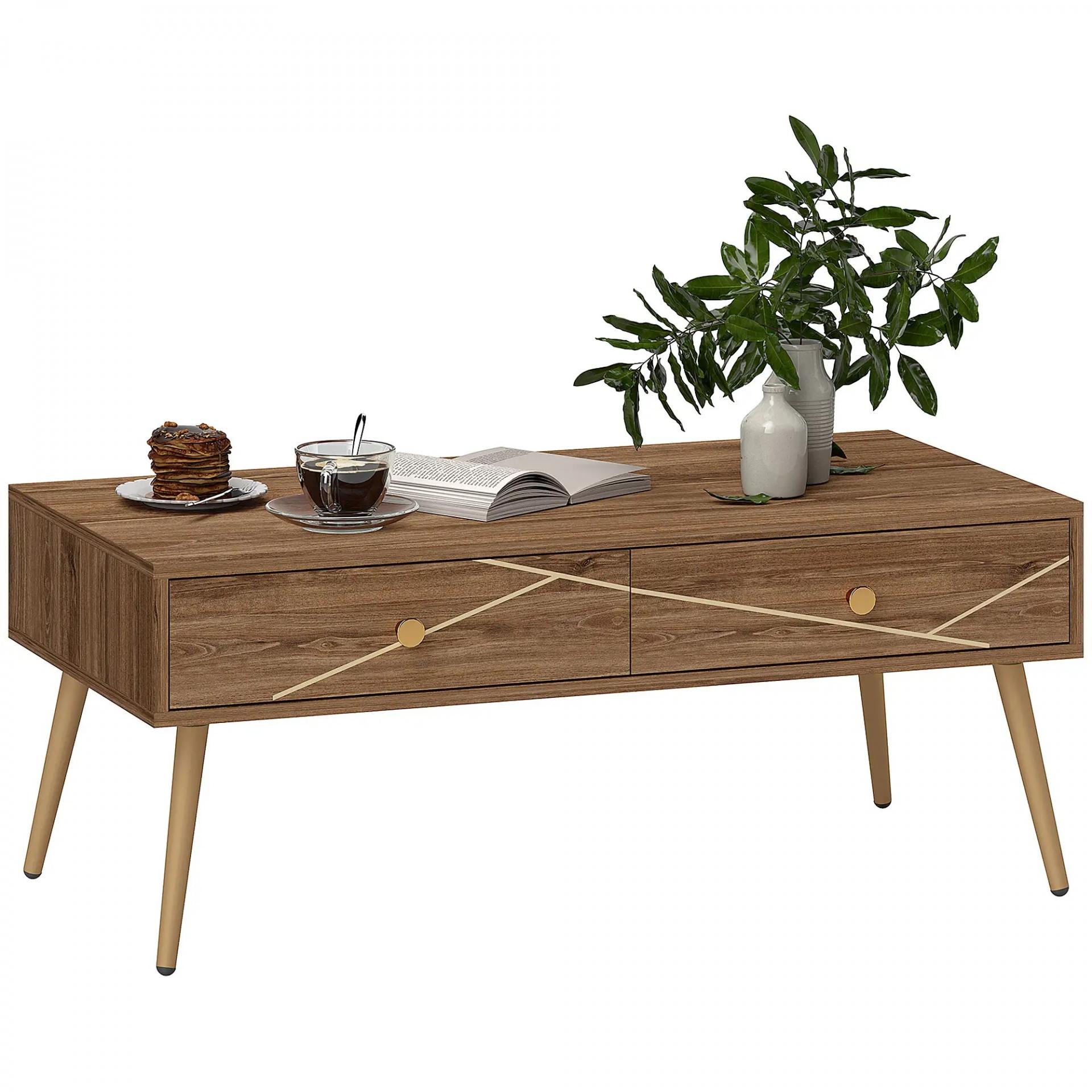 ESTILO ELEGANTE: Esta mesa de centro cuenta con paneles de melamina que simulan las vetas de la madera y detalles dorados, junto con tiradores y patas elegantes. Su estilo combinará con cualquier decoración, añadiendo un toque especial a tu sala