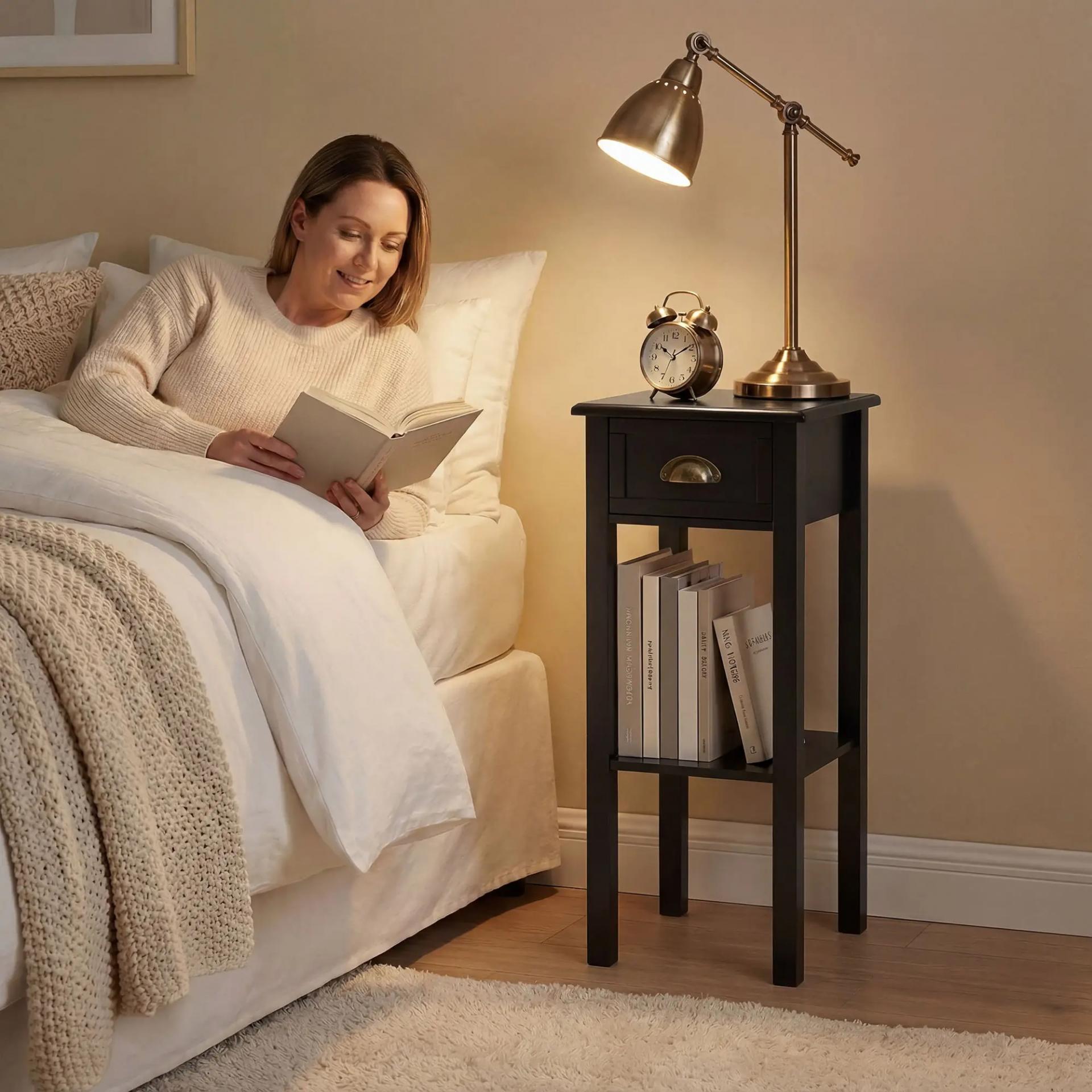 - COMPACTA Y FUNCIONAL: Mesita de noche pequeña con encimera, cajón deslizable y estante inferior. Ofrece espacio para libros, plantas o teléfono. La manija y los rieles de metal cobre antiguo facilitan la apertura y cierre del cajón