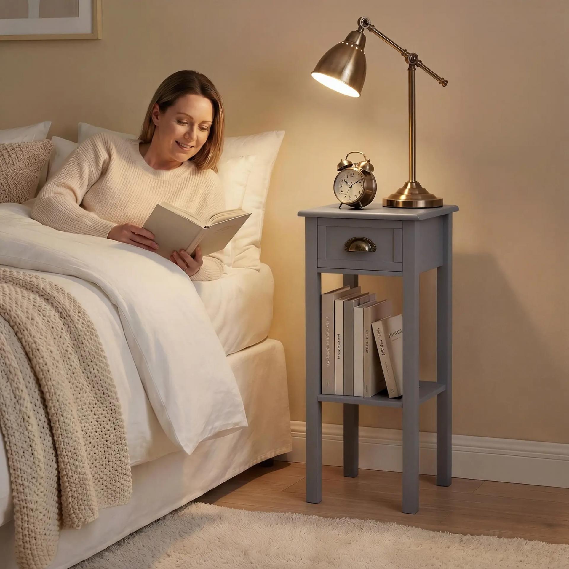 - COMPACTA Y FUNCIONAL: Mesita de noche pequeña con encimera, cajón deslizable y estante inferior. Ofrece espacio para libros, plantas o teléfono. La manija y los rieles de metal cobre antiguo facilitan la apertura y cierre del cajón