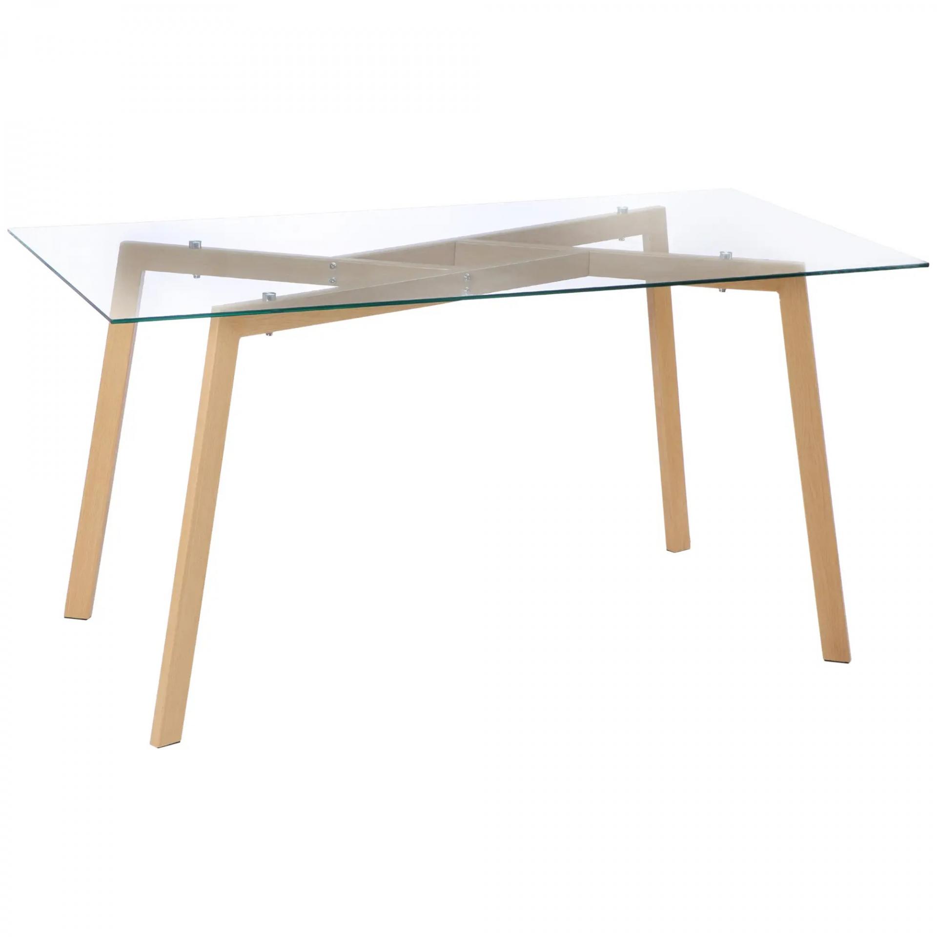 Mesa de Comedor para 6 Personas con Encimera de Cristal y Patas de Acero Efecto Madera 150x75x76 cm Transparente