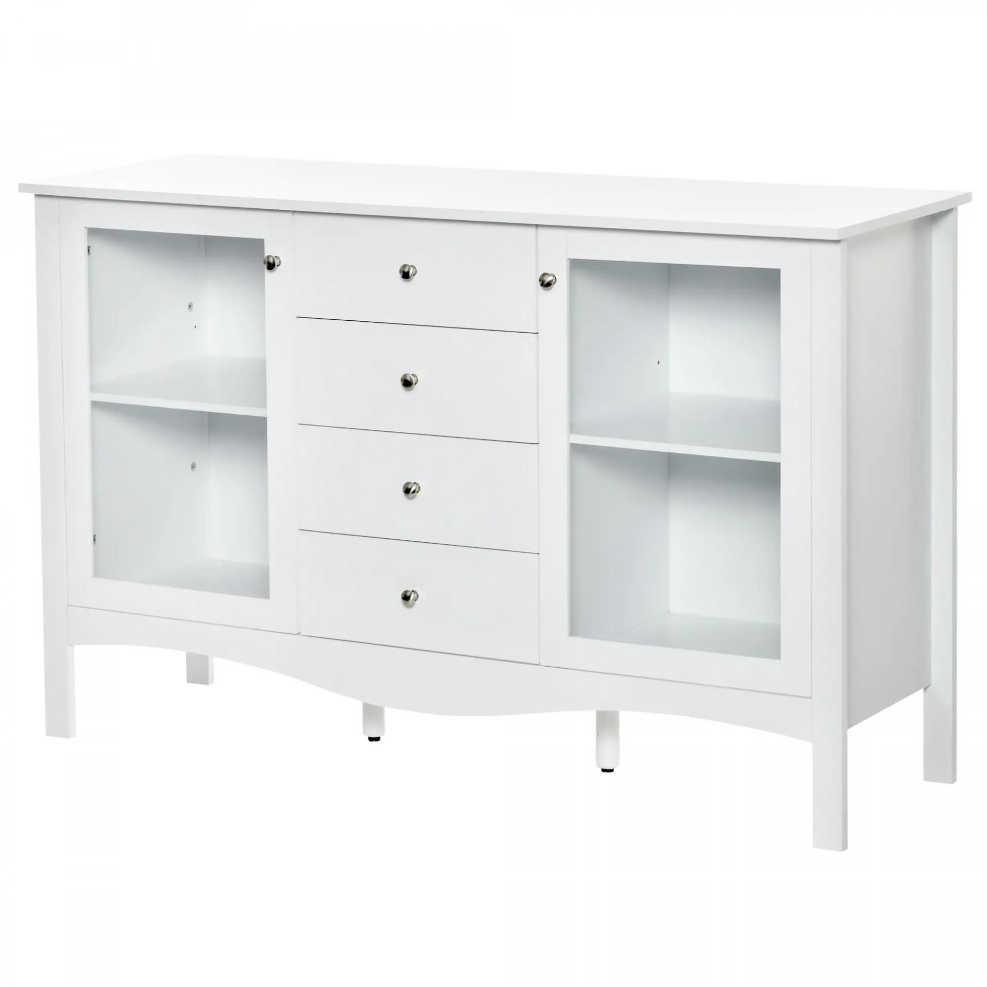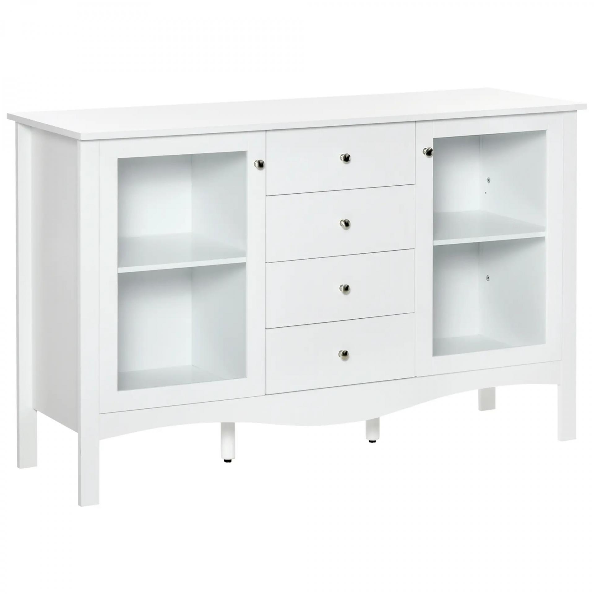 Aparador de Cocina Armario Buffet con 2 Puertas de Vidrio Estante Ajustable Interior y 4 Cajones Mueble Auxiliar para Comedor Salón 136x45x85 cm Blanco