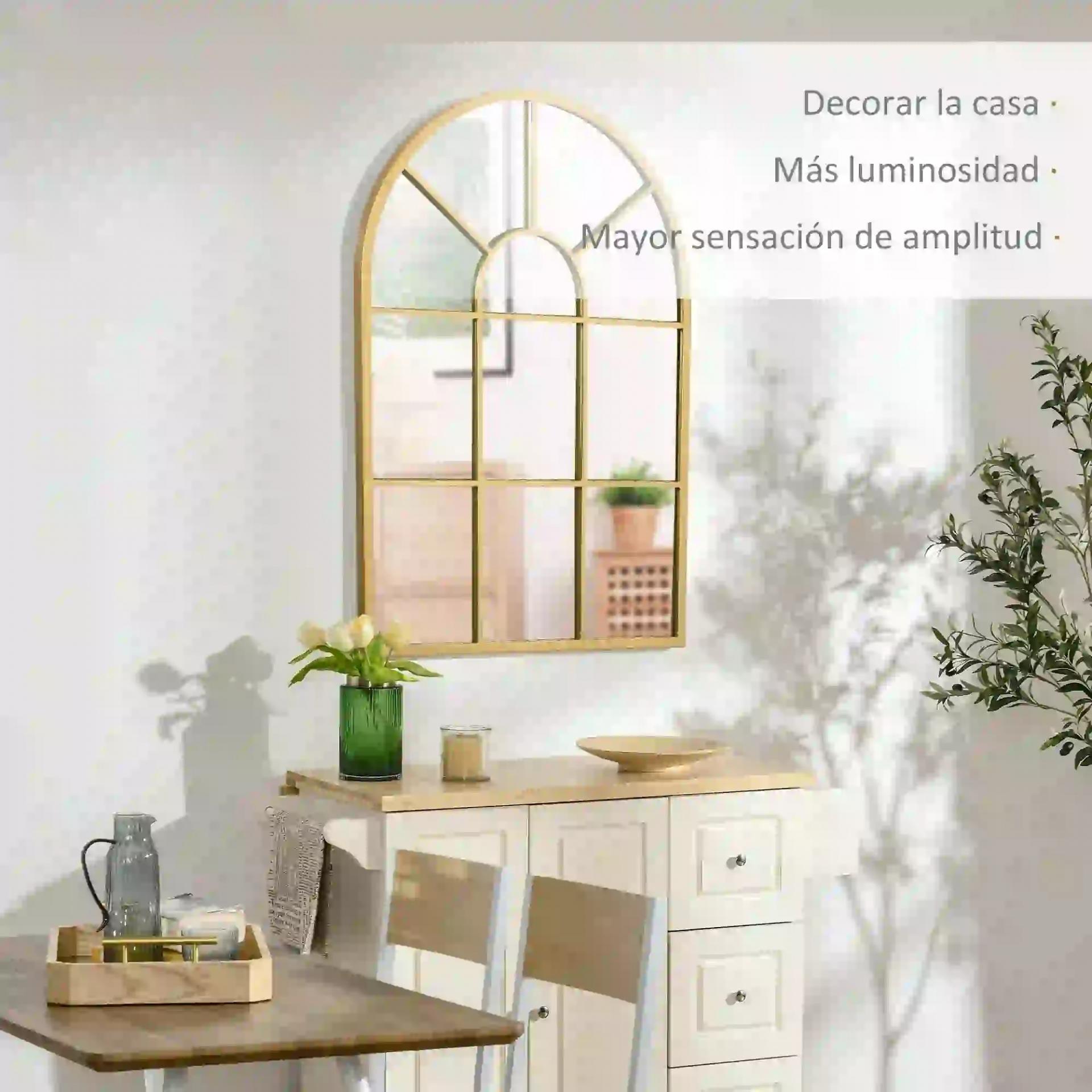 BONITA PIEZA DE DECORACIÓN: Este elegante espejo de pared decorativo en forma de ventana de arco con un bonito diseño en color dorado es el complemento perfecto para tu hogar. Al decorar las habitaciones con espejos hace que la casa luzca más luminosa y espaciosa, reflejando la luz