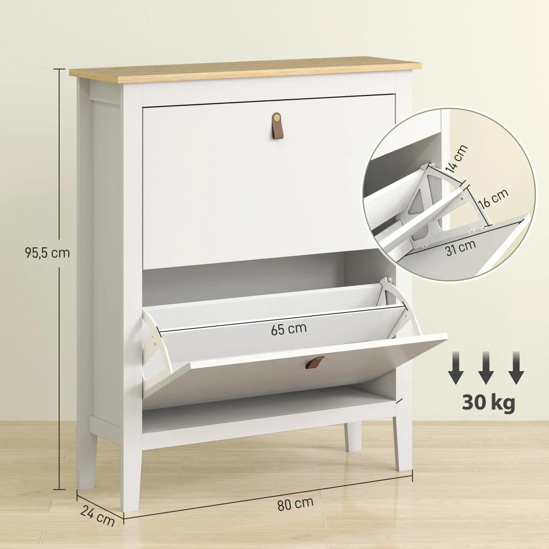 Zapatero Estrecho con 2 Compartimentos y Tiradores de Cuero PU para Pasillos y Recibidores 80x24x95,5 cm Blanco y Madera