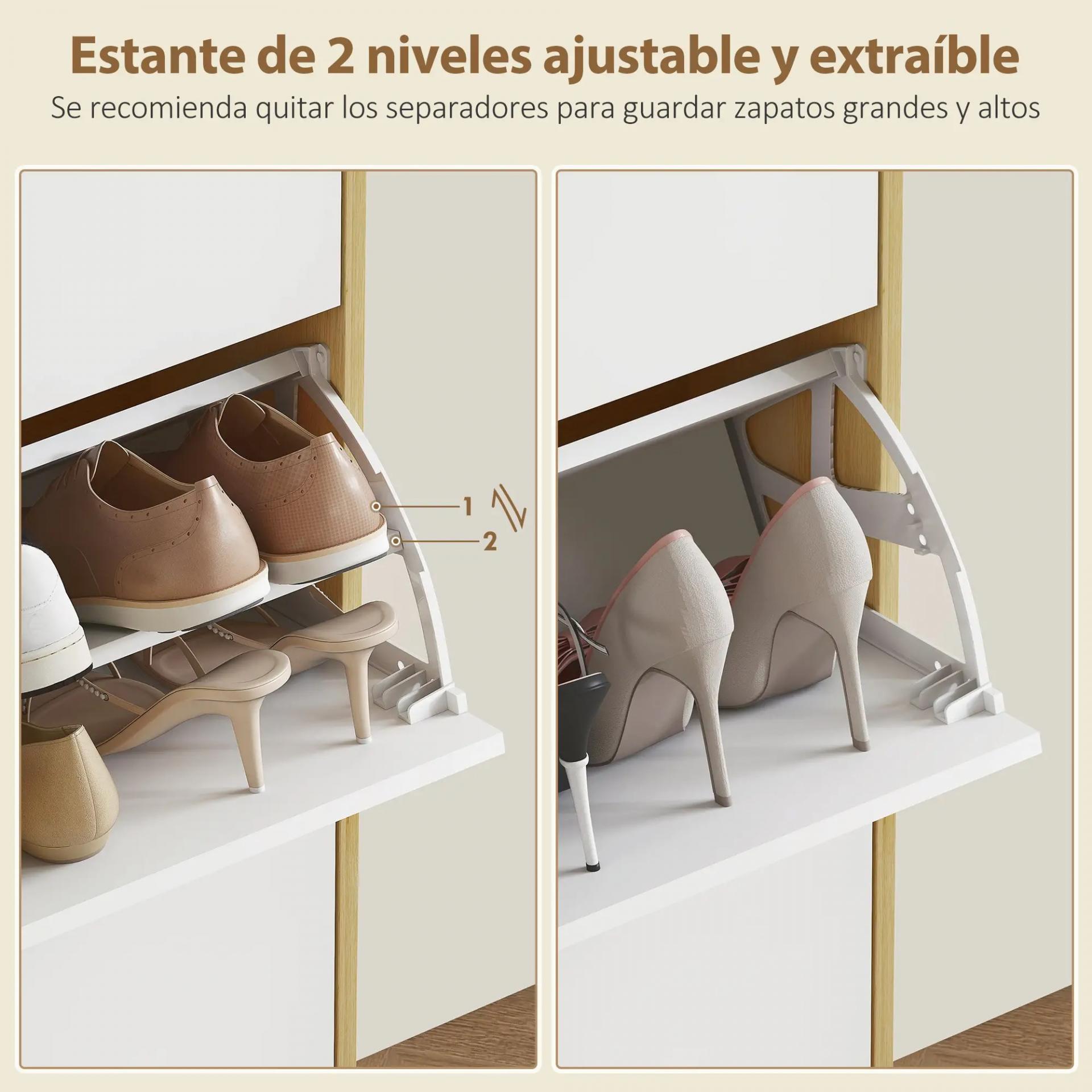 - APROVECHA EL ESPACIO AL MÁXIMO: Con solo 24 cm de fondo, este mueble zapatero es ideal para entradas y pasillos estrechos. Ofrece espacio para zapatos, 15 cm de altura inferior para más almacenamiento y permite la limpieza con robot aspirador