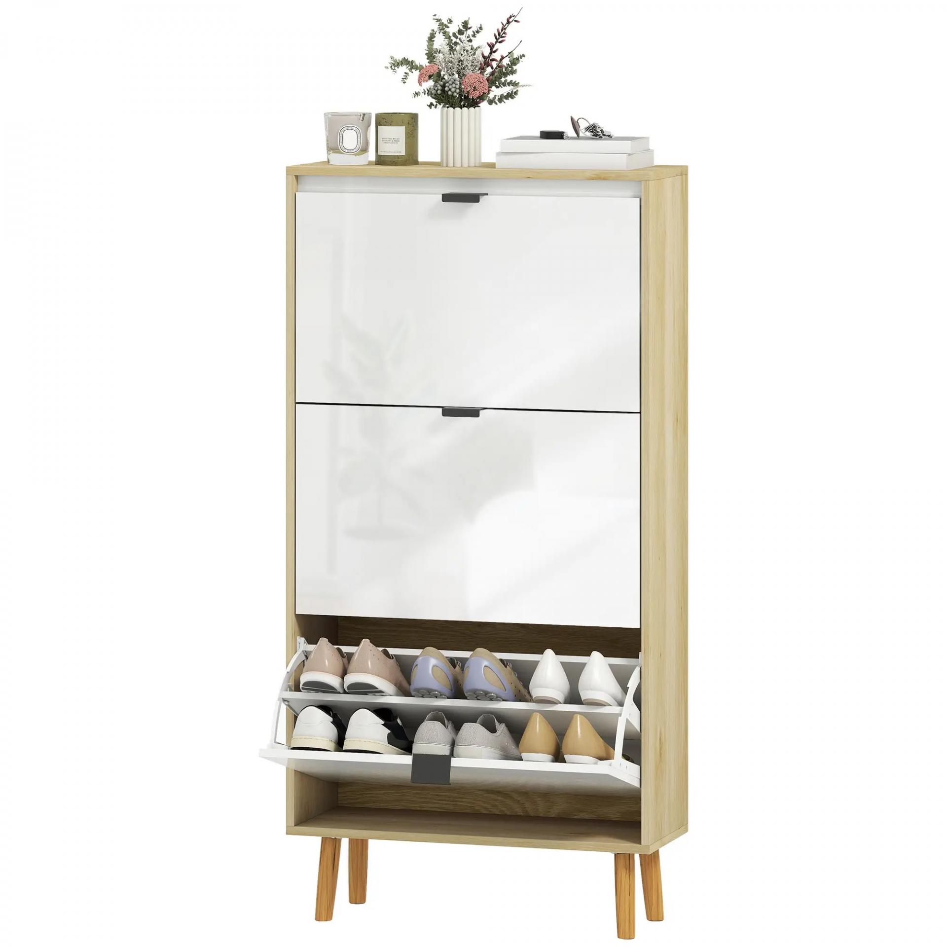 Zapatero Estrecho con 3 Puertas en Blanco Brillo Estantes Ajustables Patas de Madera para 18 Pares de Zapatos