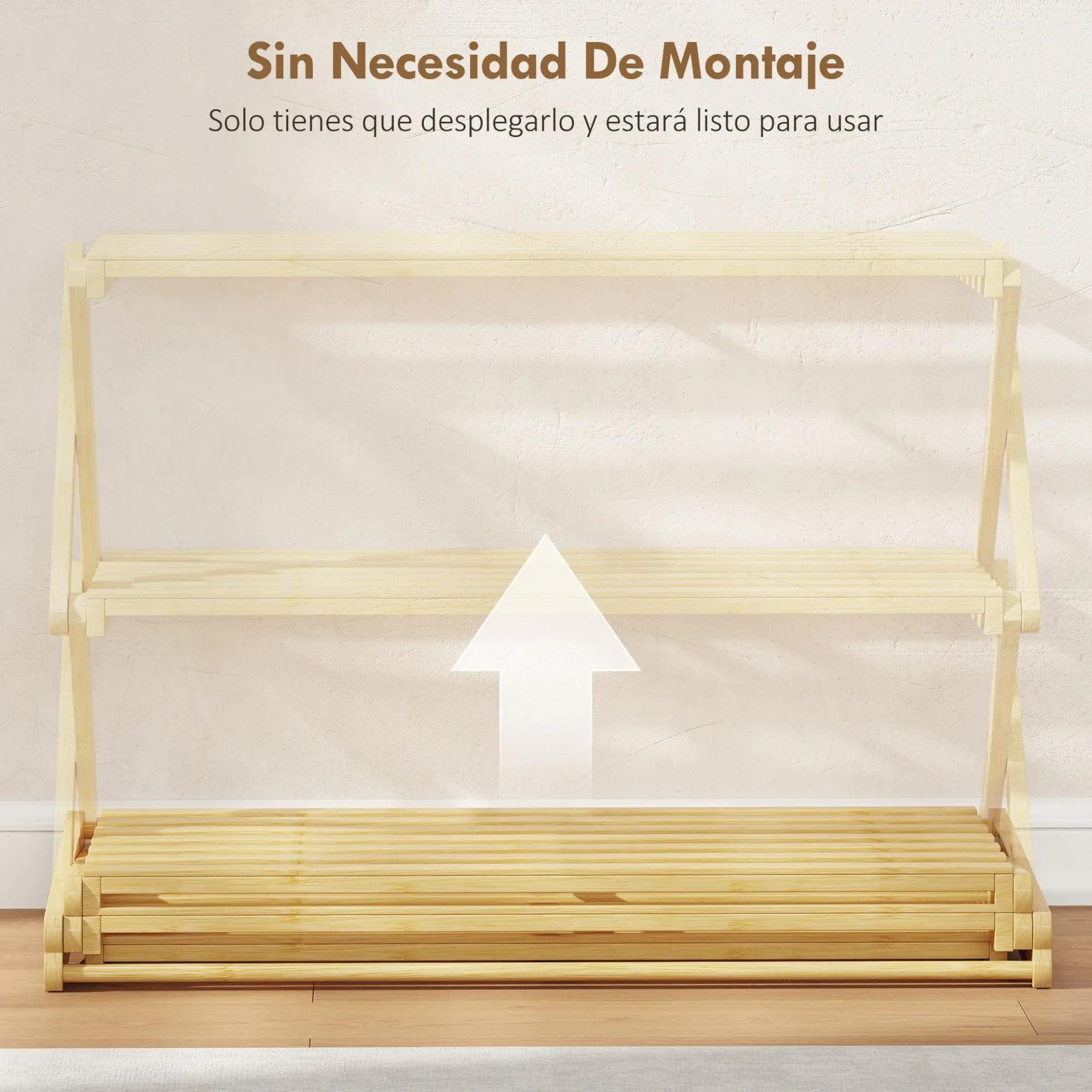 ESTRUCTURA DE BAMBÚ: Este zapatero plegable está fabricado en bambú macizo con acabado barnizado, que resiste la humedad y aporta un estilo natural y elegante. Soporta hasta 30 kg, ideal para organizar zapatos y botas de manera segura y estable