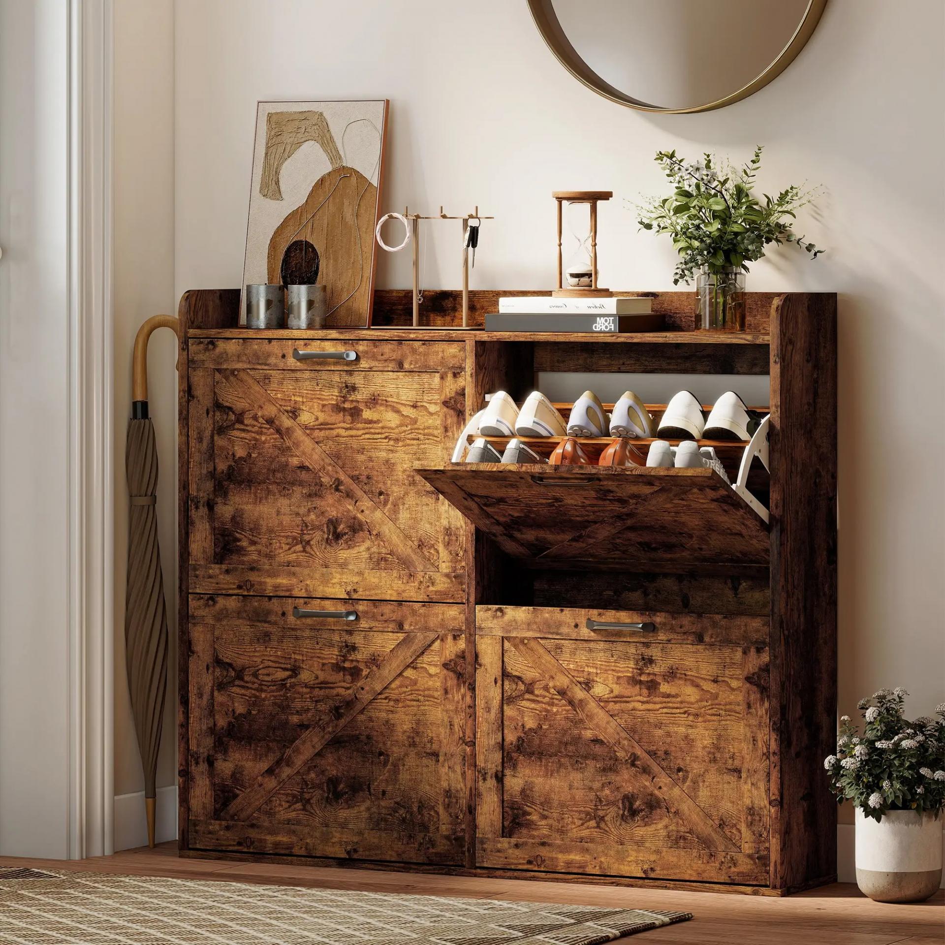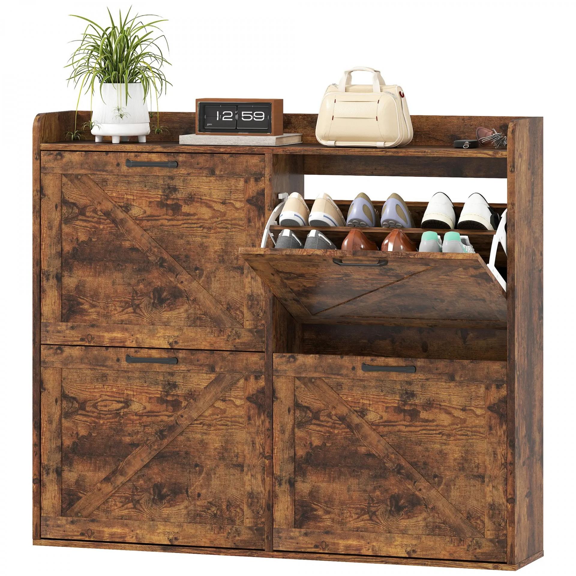 CUATRO COMPARTIMENTOS: Organiza hasta 24 pares de zapatos con este zapatero de entrada recibidor. Incluye divisores ajustables de dos niveles, que puedes mover o quitar para acomodar calzado más grande, como hasta la talla 46 o tacones altos