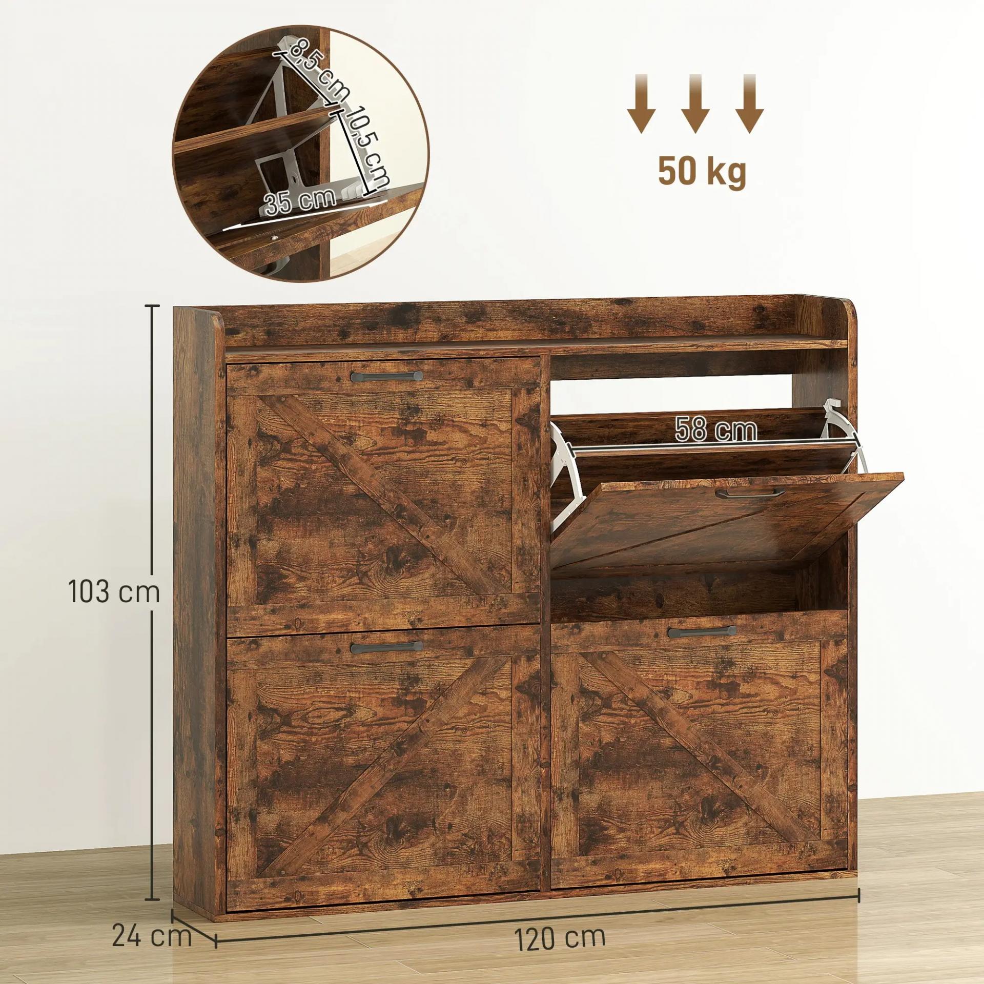 Zapatero Estrecho con 4 Compartimentos Abatibles Divisores Ajustables para 24 Pares con Antivuelco 120x24x103 cm Marrón