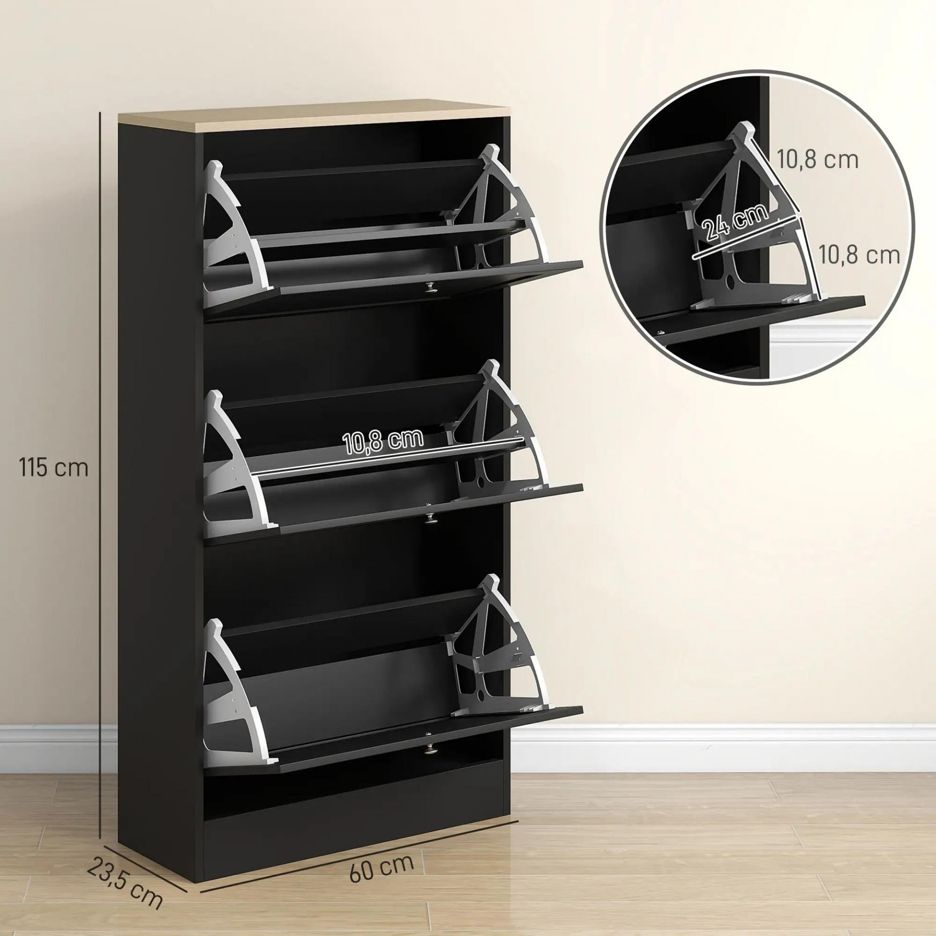Mueble Zapatero Moderno con 3 Cajones Abatibles y Estantes Ajustables para 18 Pares de Zapatos 60x23,5x115 cm Negro