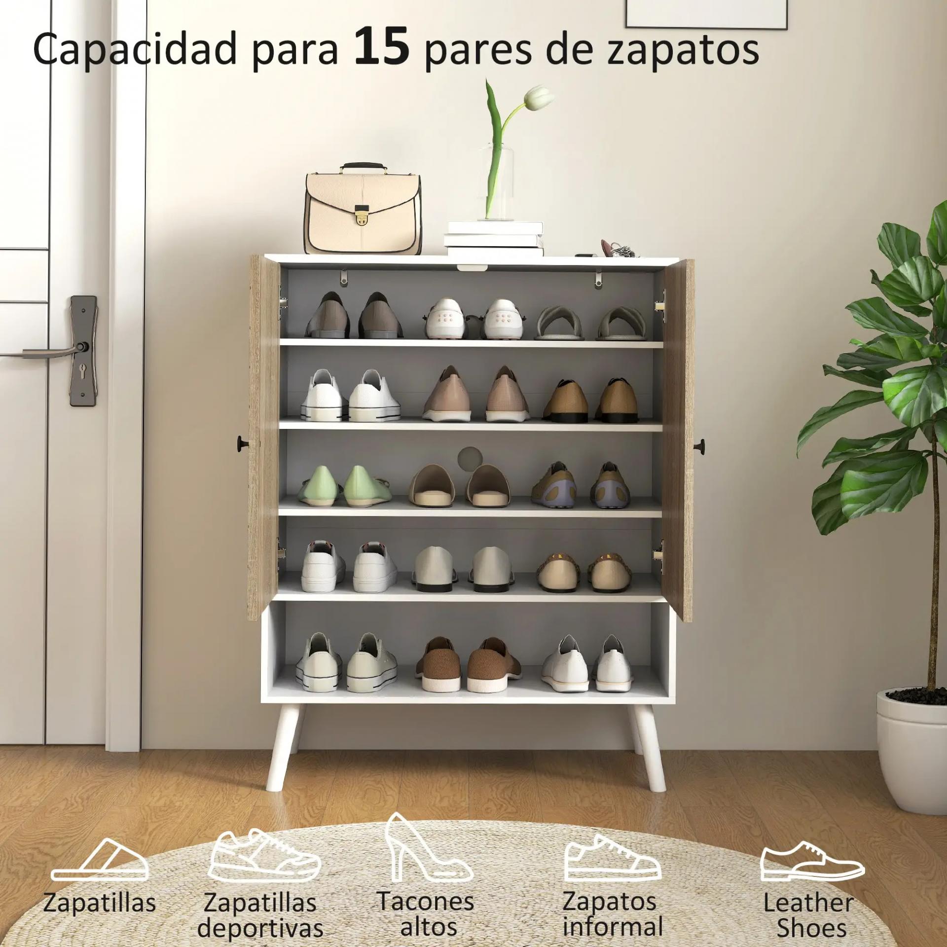 - AMPLIO ESPACIO DE ALMACENAJE: Este mueble zapatero dispone de cuatro baldas cerradas con capacidad para hasta 15 pares, una balda inferior abierta para los zapatos de uso diario y una superficie superior perfecta para dejar llaves o bolsos