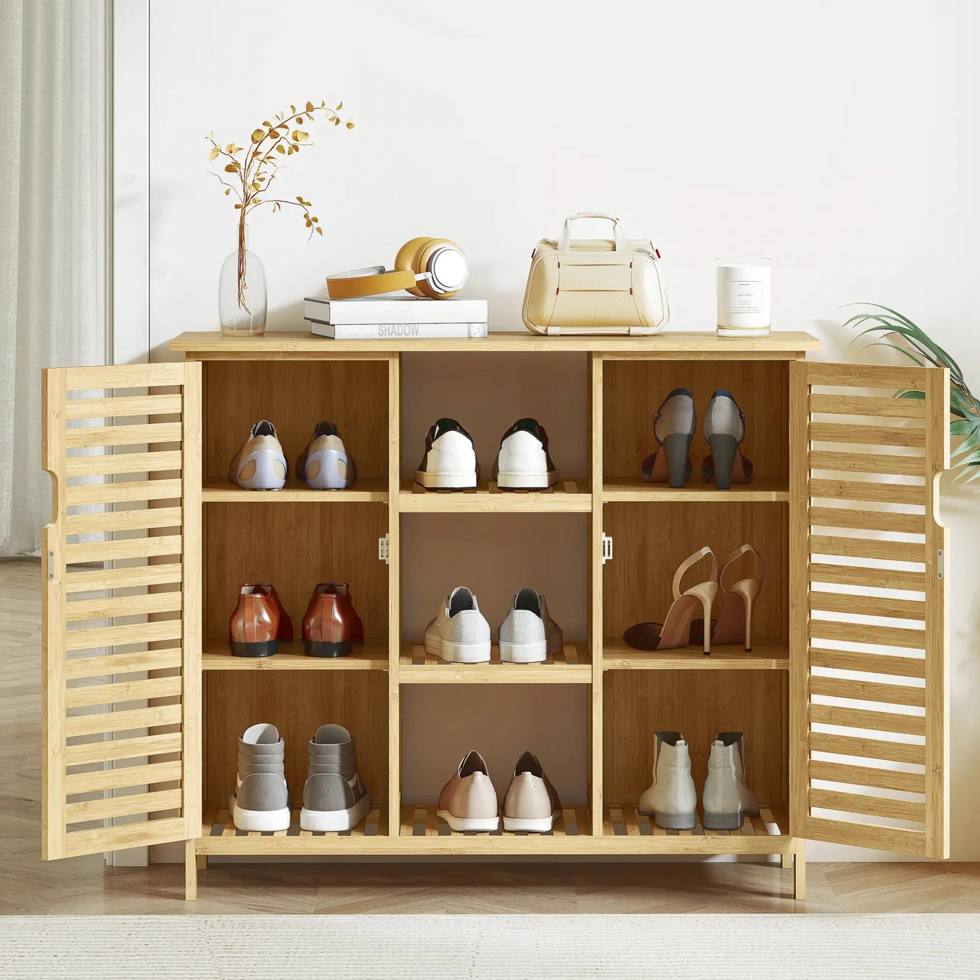 DISEÑO NATURAL Y TRANSPIRABLE: Fabricado en bambú natural, con puertas de lamas y estantes listonados que favorecen la circulación del aire. Mantiene tus objetos frescos, secos y sin olores, aportando además un toque cálido y decorativo a tu hogar