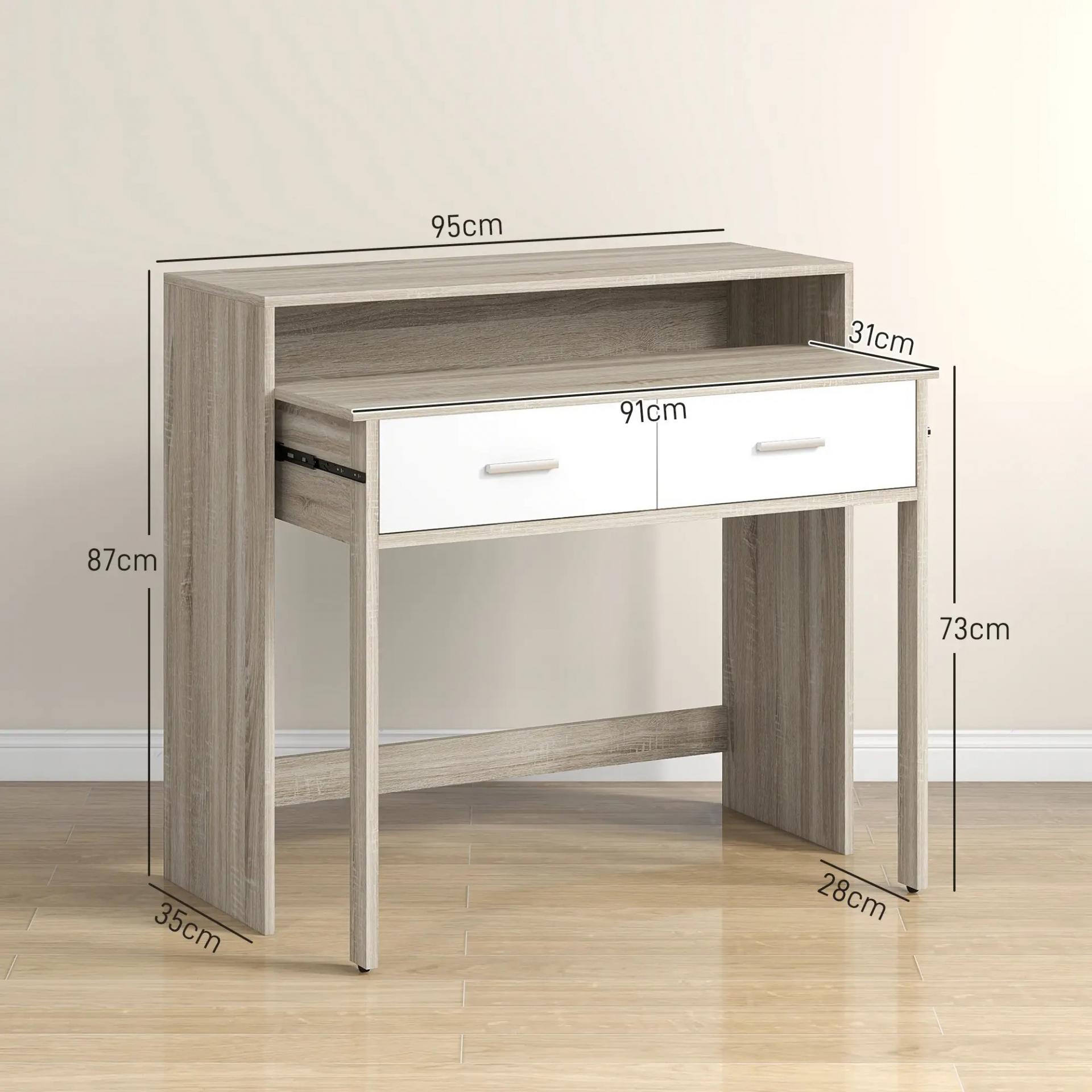 - MEDIDAS TOTALES: 95x35x87 cm (LxANxAL), Peso máximo soportado: 26 kg (total), 10 kg (mesa), 3 kg (cajón). Requiere montaje