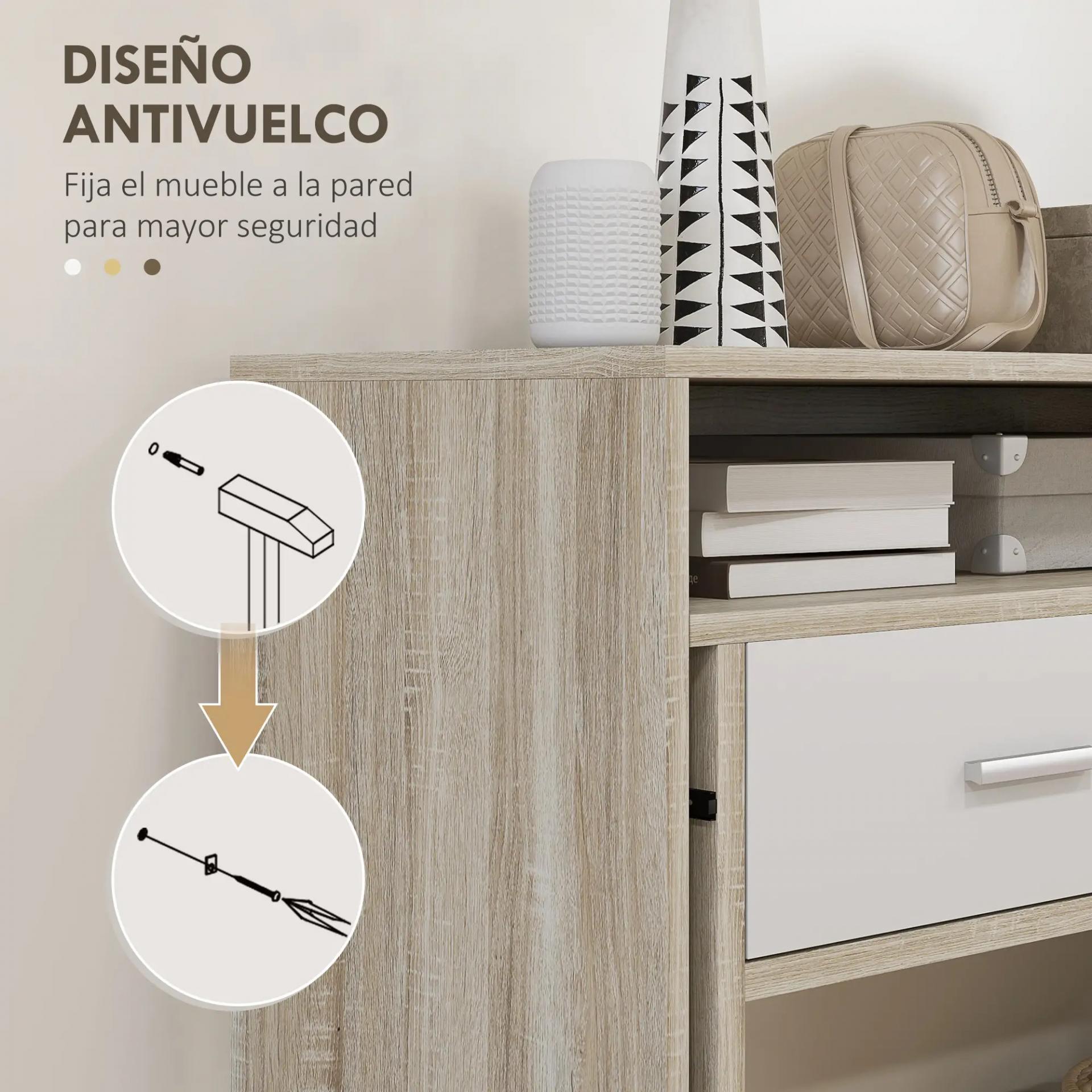 - RESISTENTE Y SEGURA: Hecha de melamina de madera, este mueble de recibidor es robusta y está diseñada para un uso prolongado. Incluye un sistema antivuelco que garantiza mayor seguridad y estabilidad en cualquier parte de tu hogar. Además, es fácil de limpiar con un paño húmedo