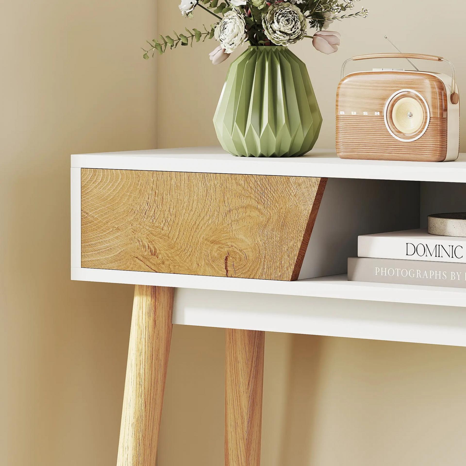 AMPLIO ALMACENAMIENTO: Esta mesa consola cuenta con dos cajones, un compartimento abierto y una superficie espaciosa, ayudándote a mantener ordenada la entrada o cualquier estancia de forma práctica y eficiente