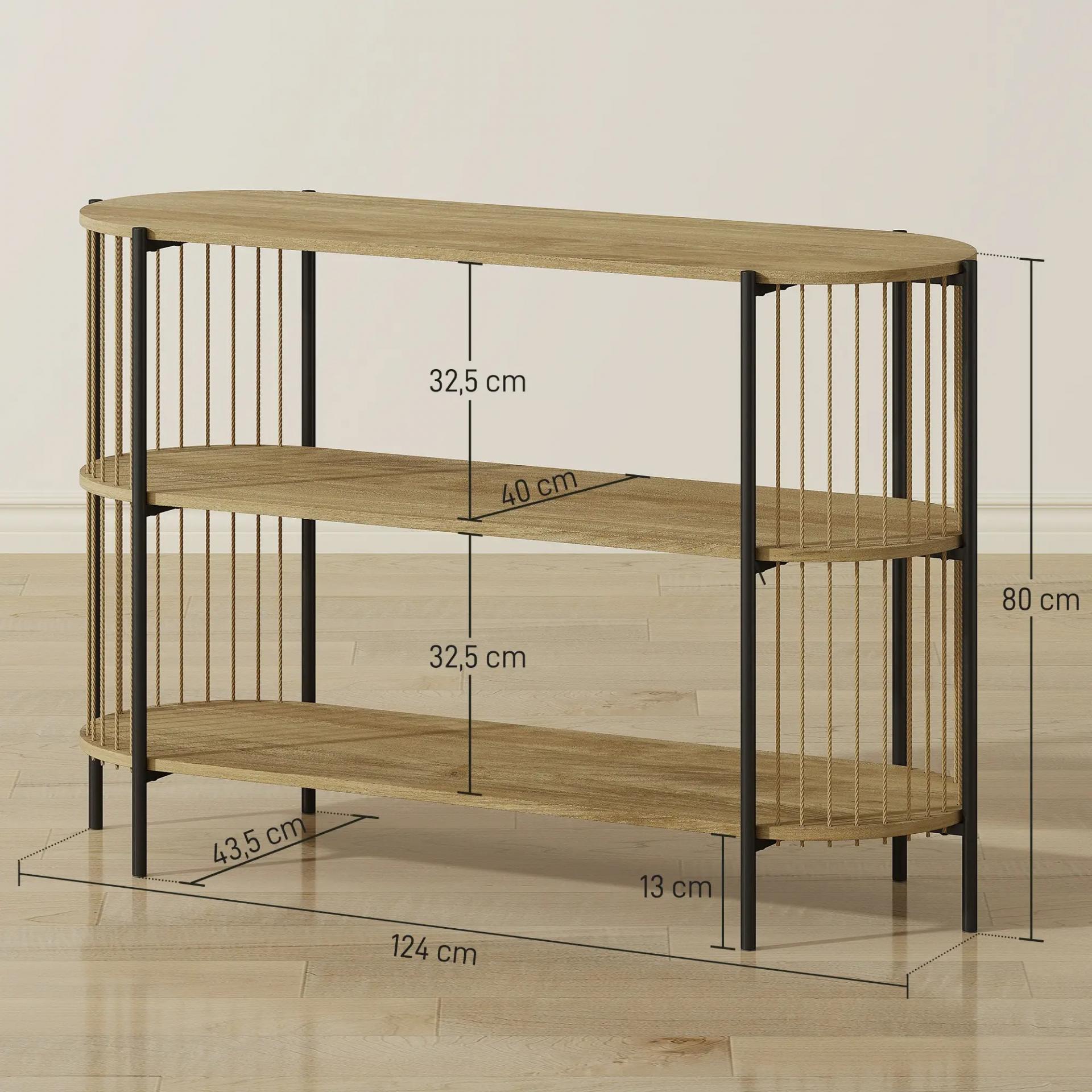 MEDIDAS TOTALES: 124x43,5x80 cm (LxANxAL). Capacidad máxima de carga: 60 kg (total) y 20 kg (por estante). Esta consola de entrada requiere montaje