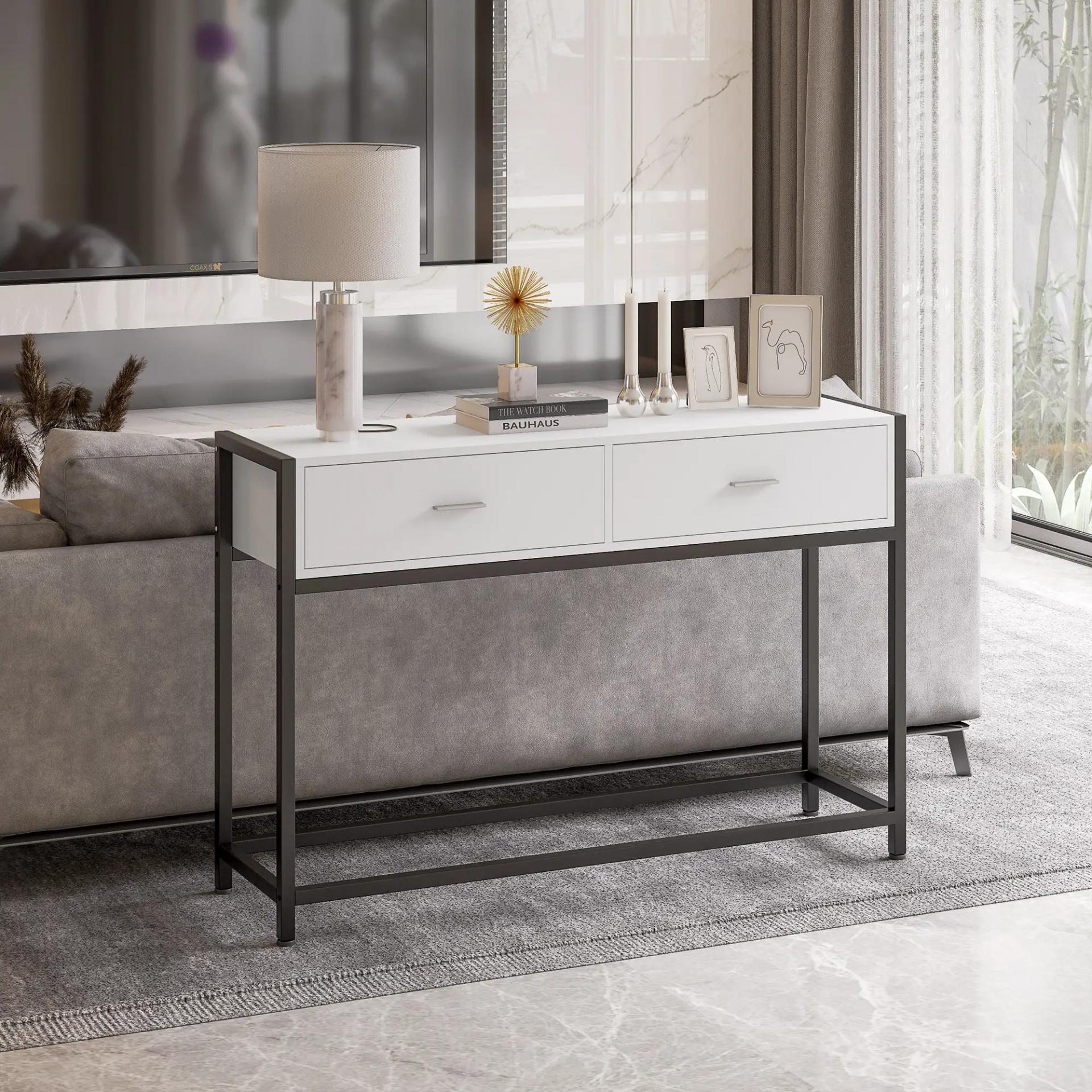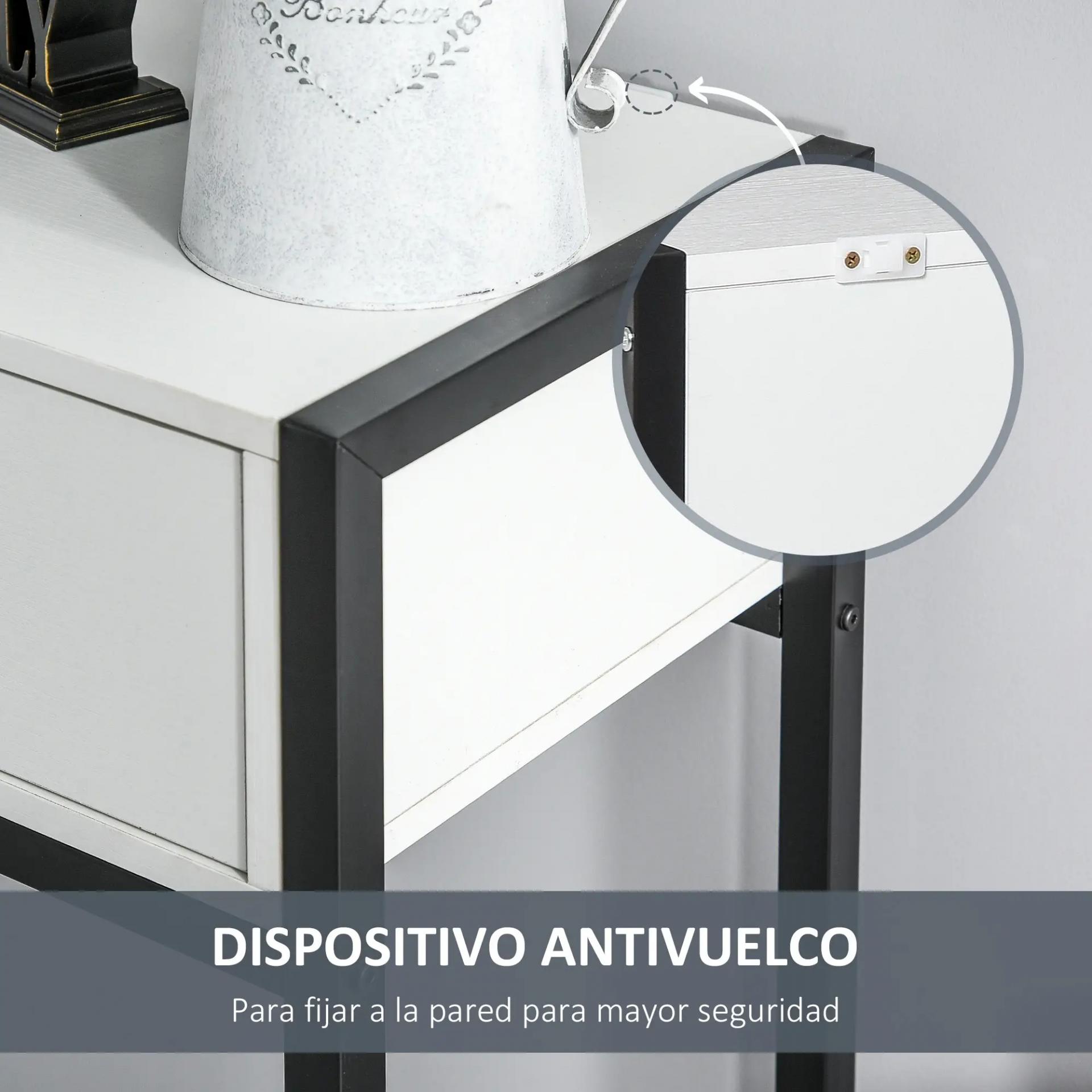 - ESTRUCTURA RESISTENTE: Mesa de recibidor con estructura de metal reforzado y cuerpo del mueble con 2 cajones y amplia encimera de melamina de madera en acabado de color blanco. Es un mueble resistente y con buena capacidad de carga, pudiendo soportar hasta 50 kg