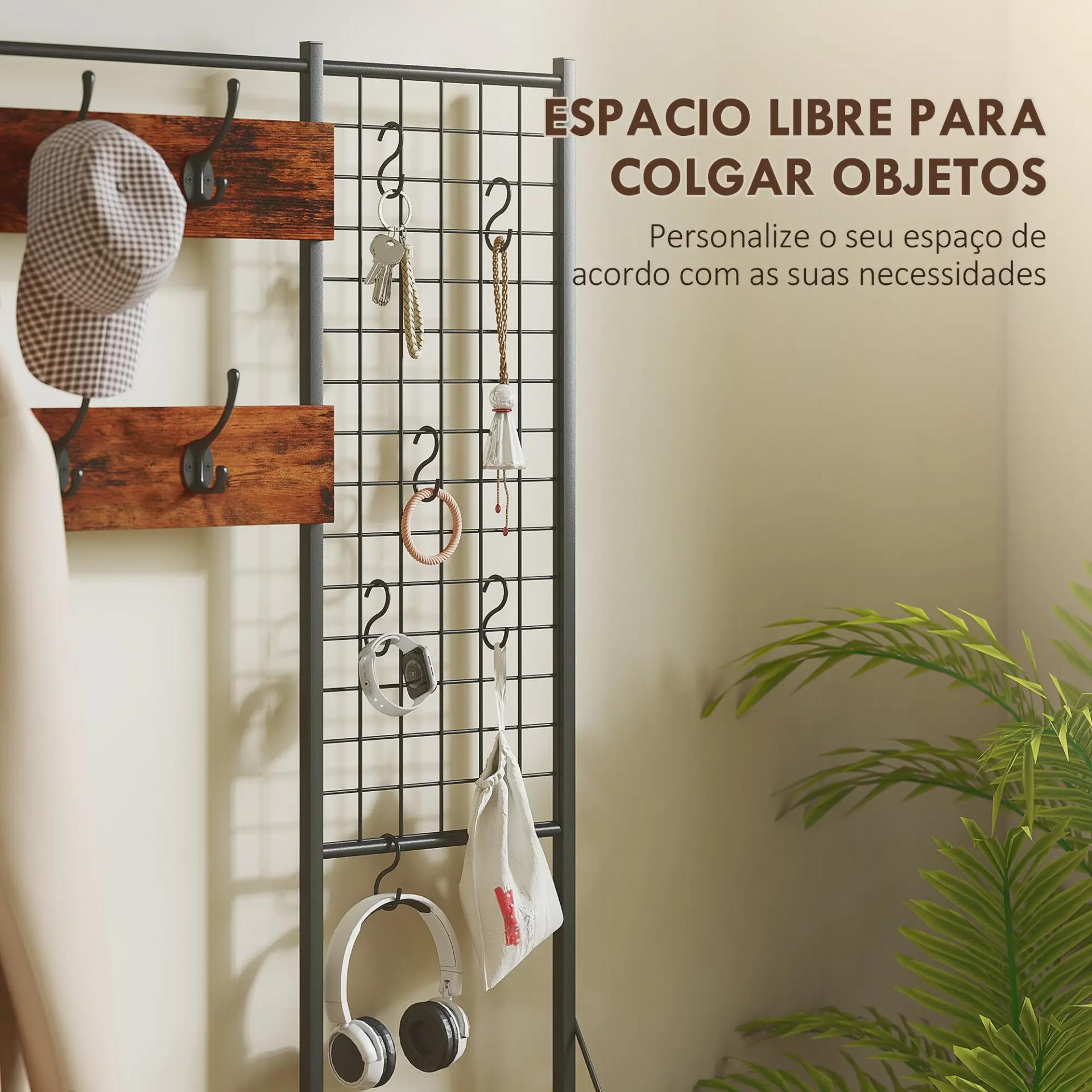 - ZONA DE COLGADO PERSONALIZABLE: El panel de rejilla lateral del perchero zapatero permite colgar fotos, notas o postales con clips (no incluidos) y usar los ganchos S para auriculares, llaves, paraguas o decoración
