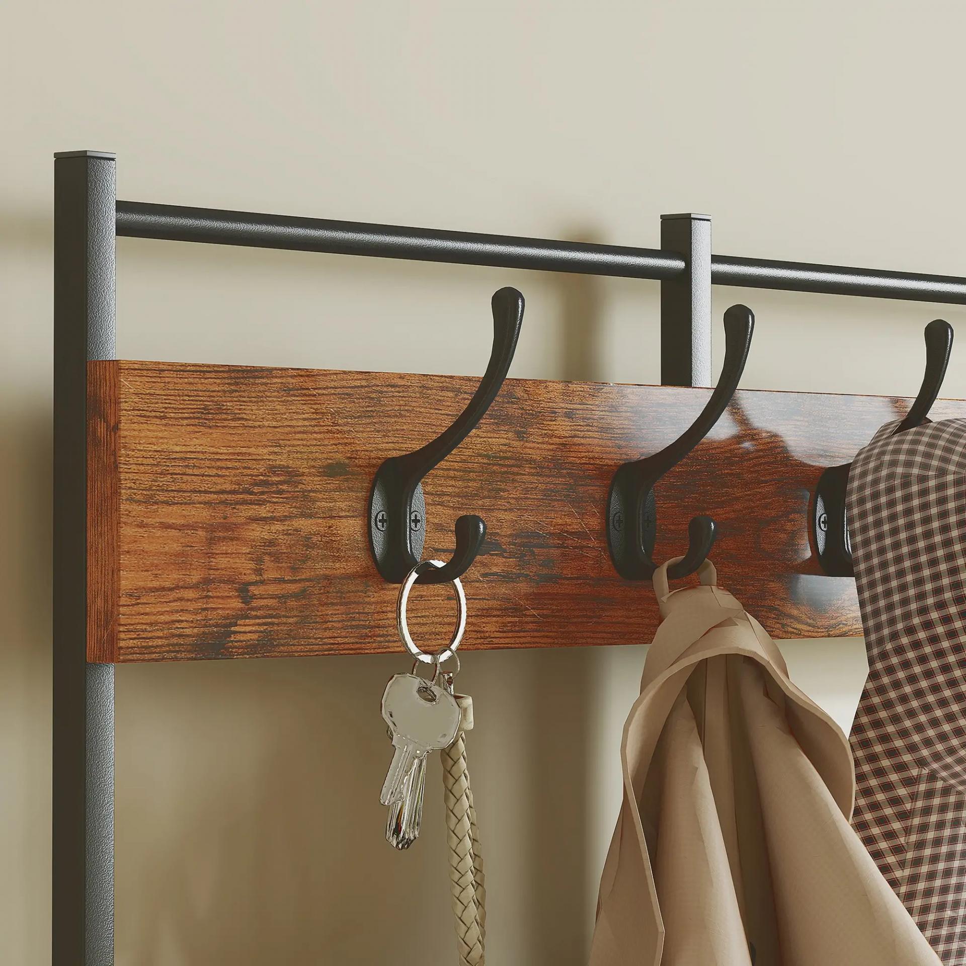 - ESTILO INDUSTRIAL DECORATIVO: Su combinación de estructura metálica negra y acabados en madera marrón rústico aporta un toque moderno y cálido, perfecto para entradas, dormitorios o vestidores