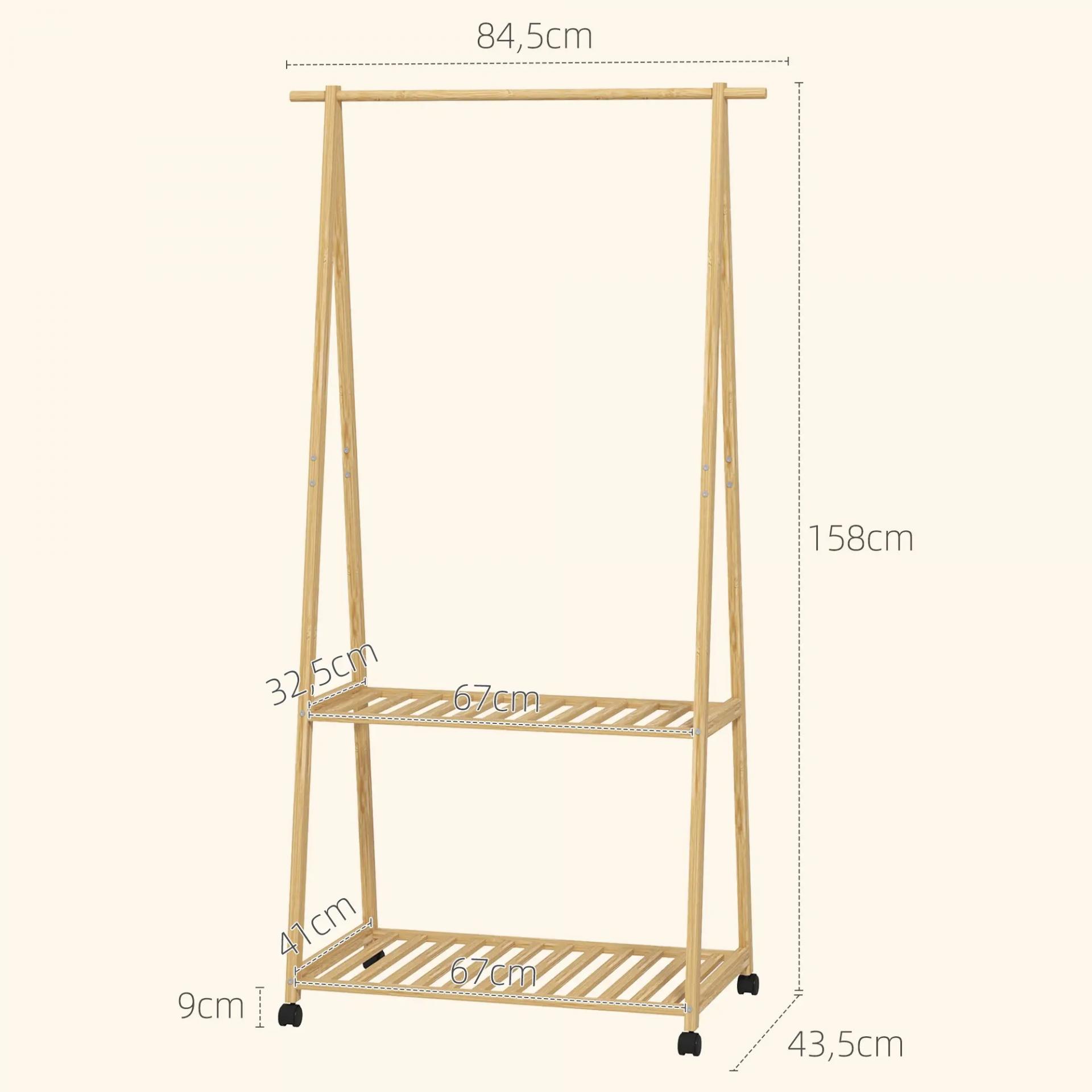 Perchero Burro para Ropa de Bambú con Ruedas 2 Estantes Abiertos y 2 Ganchos 84,5x43,5x158 cm Natural