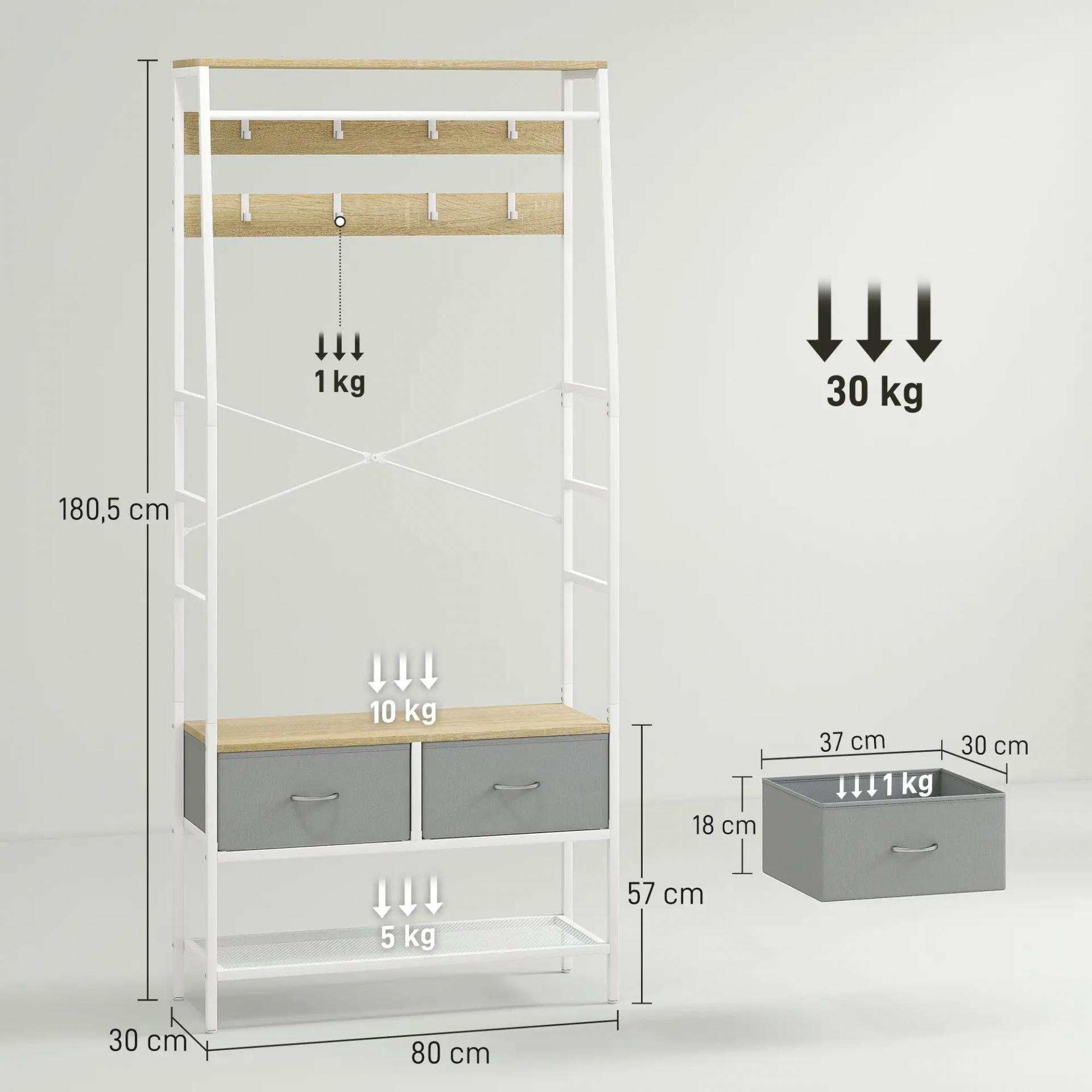 Perchero Zapatero con Zapatero Ganchos Cajones Barra y Eatante para Entrada Pasillo Salón 80x30x180,5 cm Natural