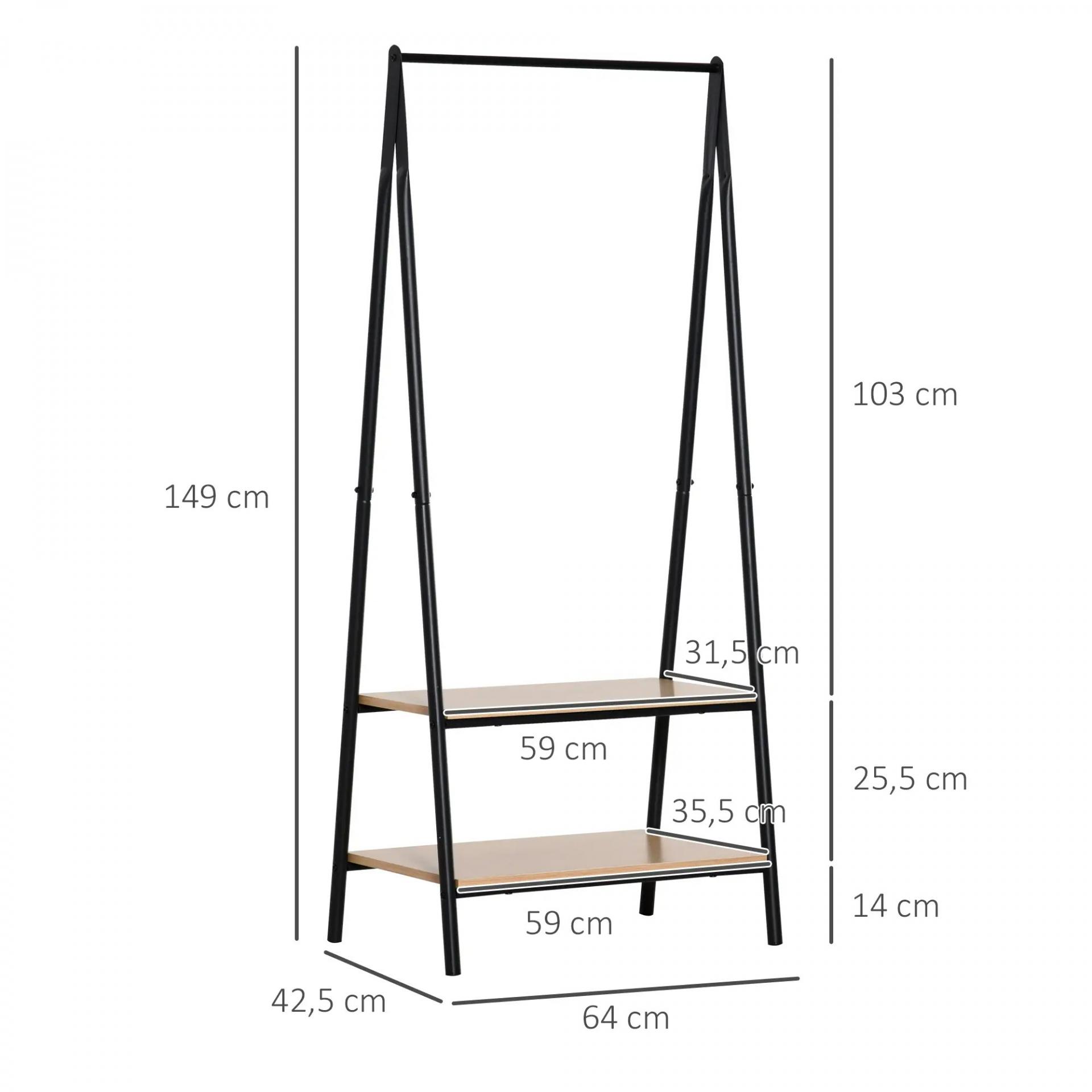 Perchero de Ropa Perchero de Pie con 2 Estantes de Almacenamiento Barra para Colgar y Marco de Acero 64x42,5x149cm Negro