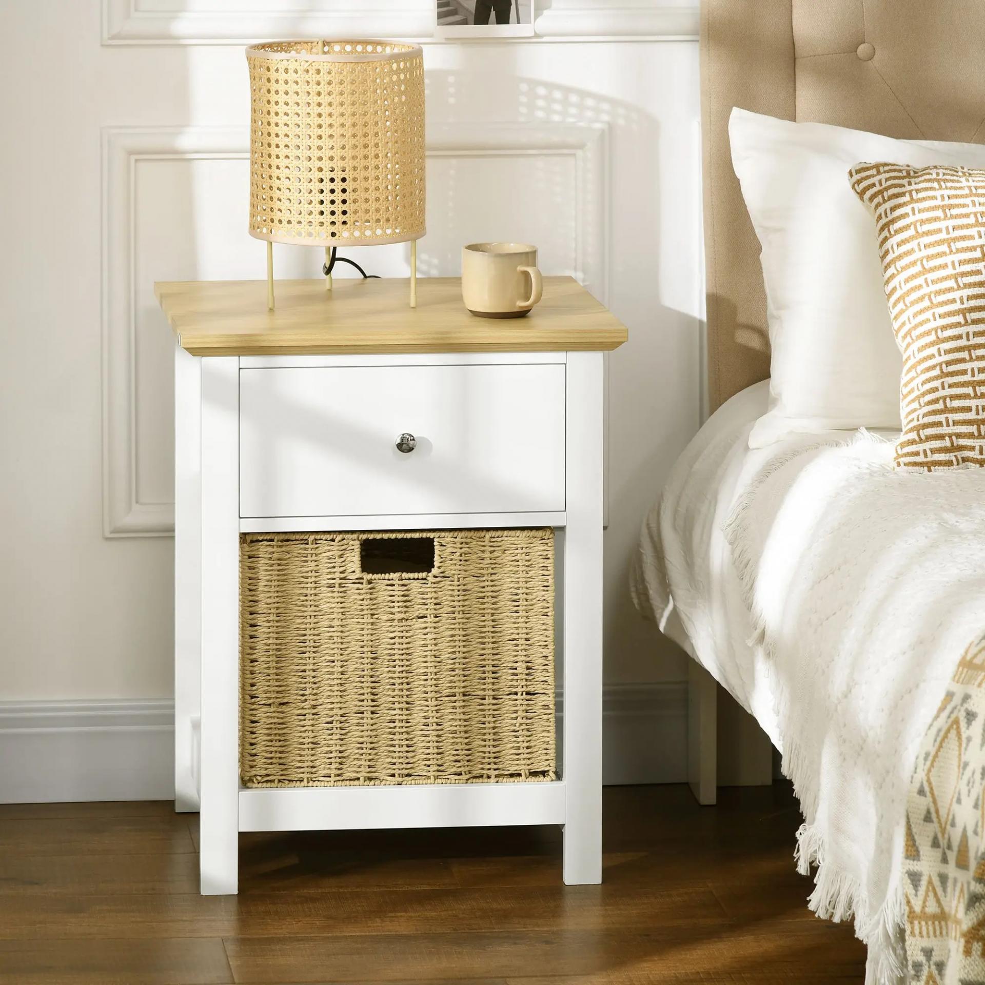 Mesita de Noche con Cajón y Cesta de Ratán Plegable Mesa Auxiliar para Salón Dormitorio 49x39x64 cm Blanco y Natural