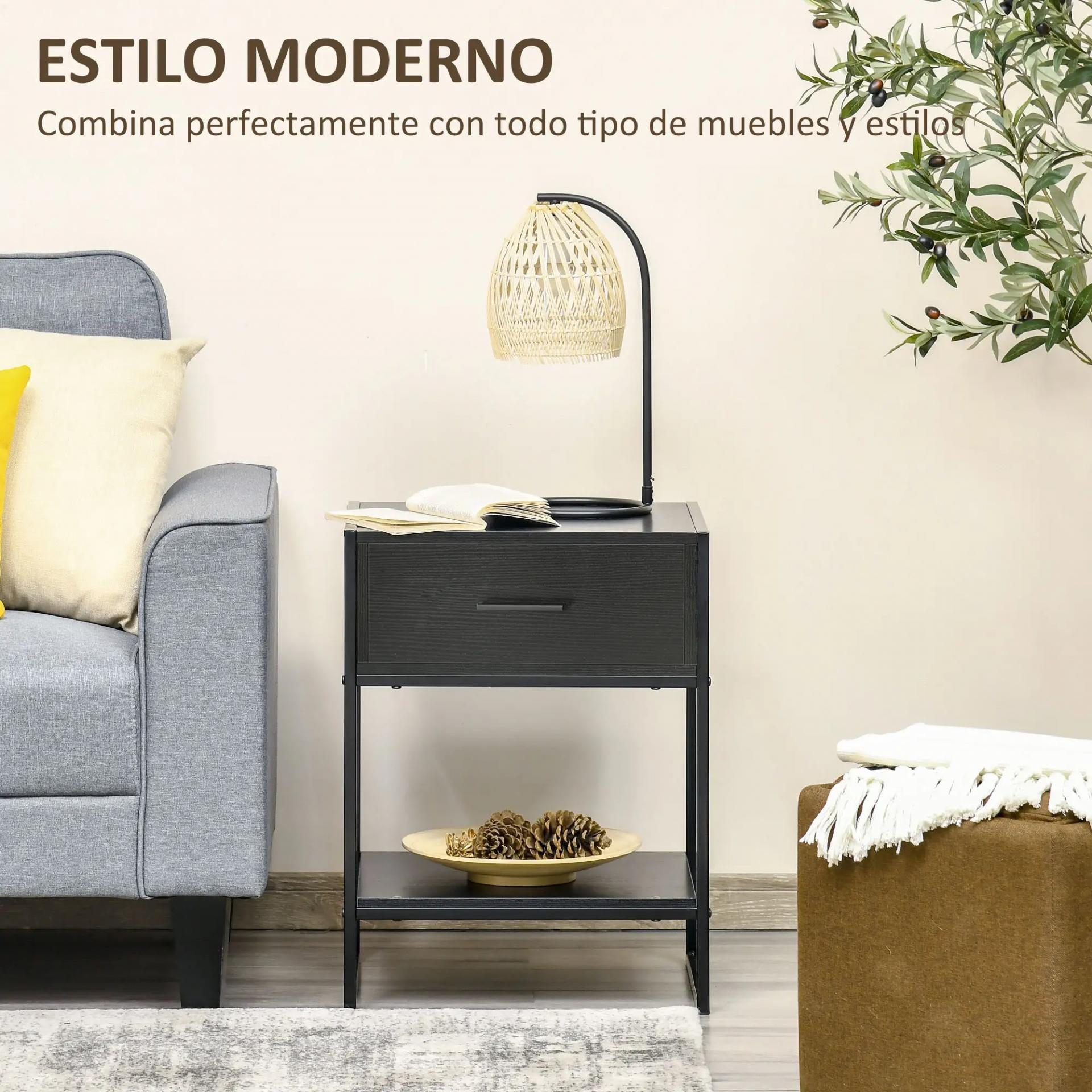 ESTILO MODERNO: Mesa de noche de diseño simple y único con encimera, cajón y estante de color de color negro. Un complemento actual y elegante para cualquier habitación, fácilmente integrable a la decoración ya existente