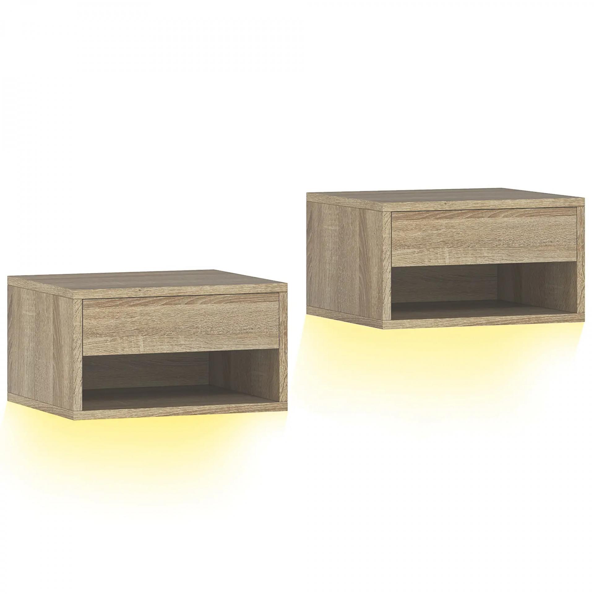 Juego de 2 Mesitas de Noche Flotantes con Luces LED RGB Control de APP Cajón Estante Abierto Natural