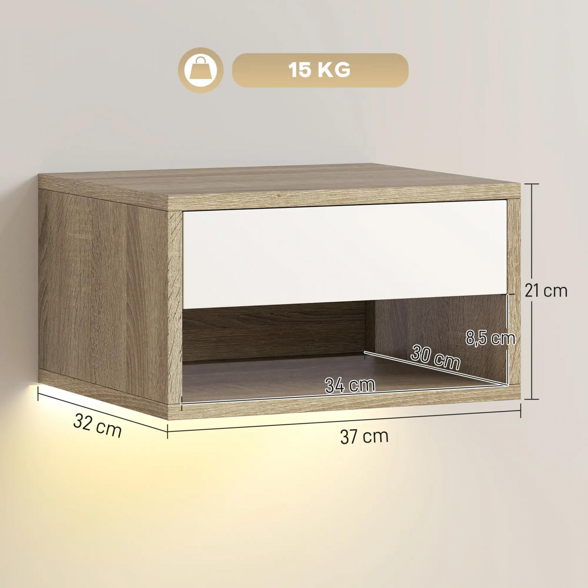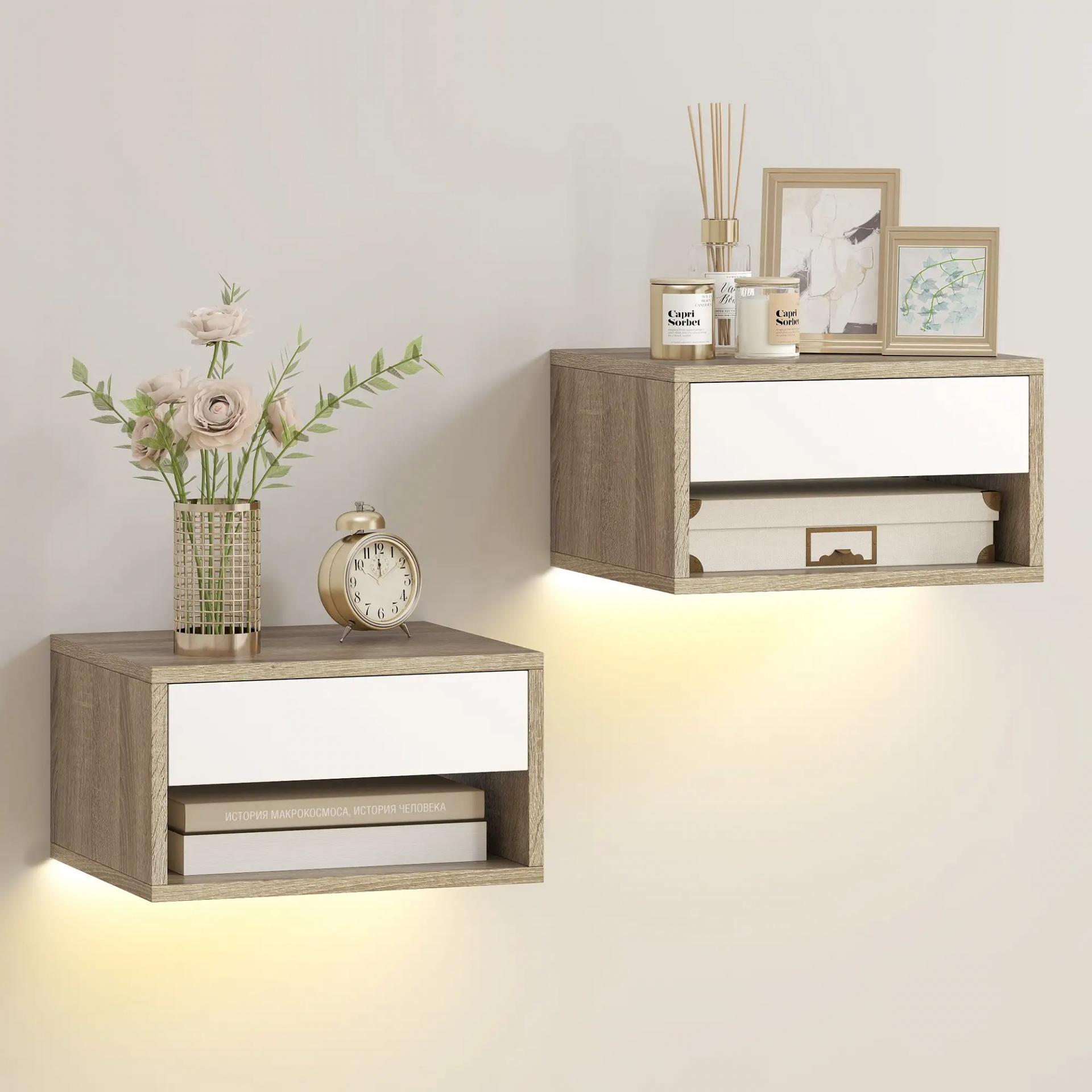 Juego de 2 Mesitas de Noche Flotantes con Luces LED RGB Control de APP Cajón Estante Abierto Natural y Blanco