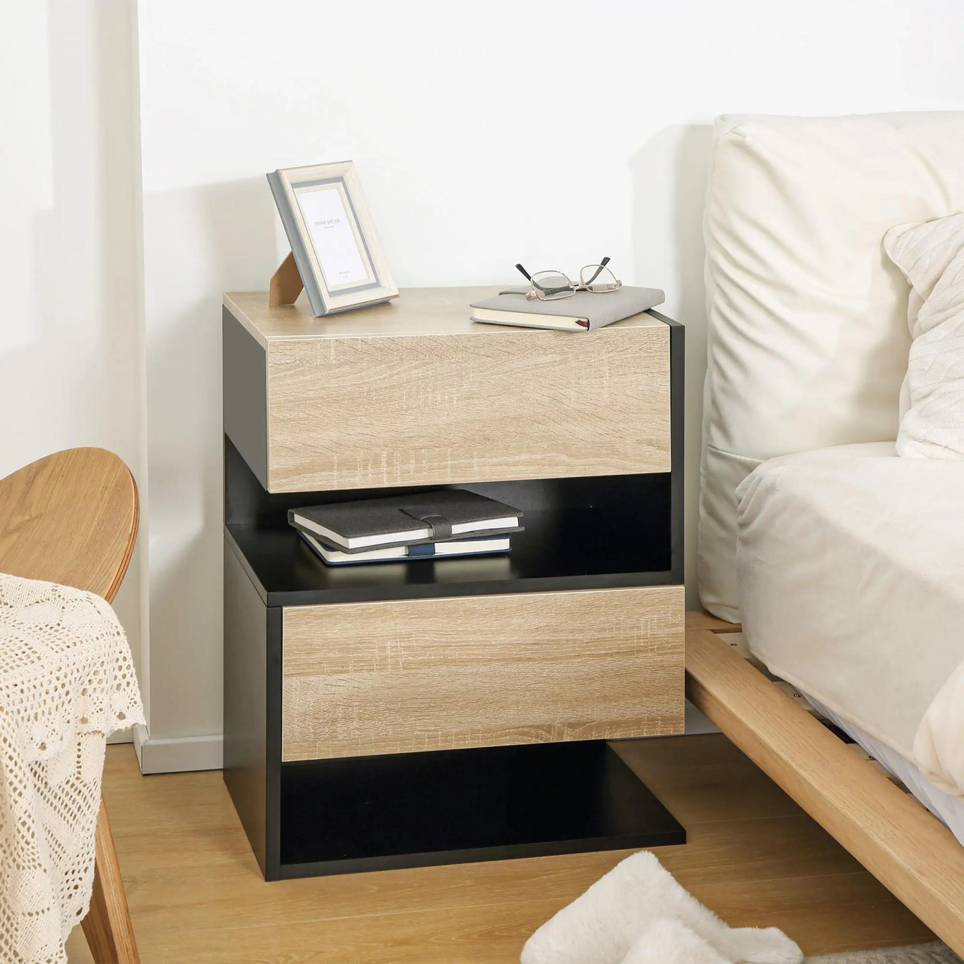 CONJUNTO DE 2 MESITAS: 2 mesillas de noche de estilo moderno y elegante de color en contraste negro y madera de roble. Para adaptarse perfectamente en tu habitación o sala de invitados