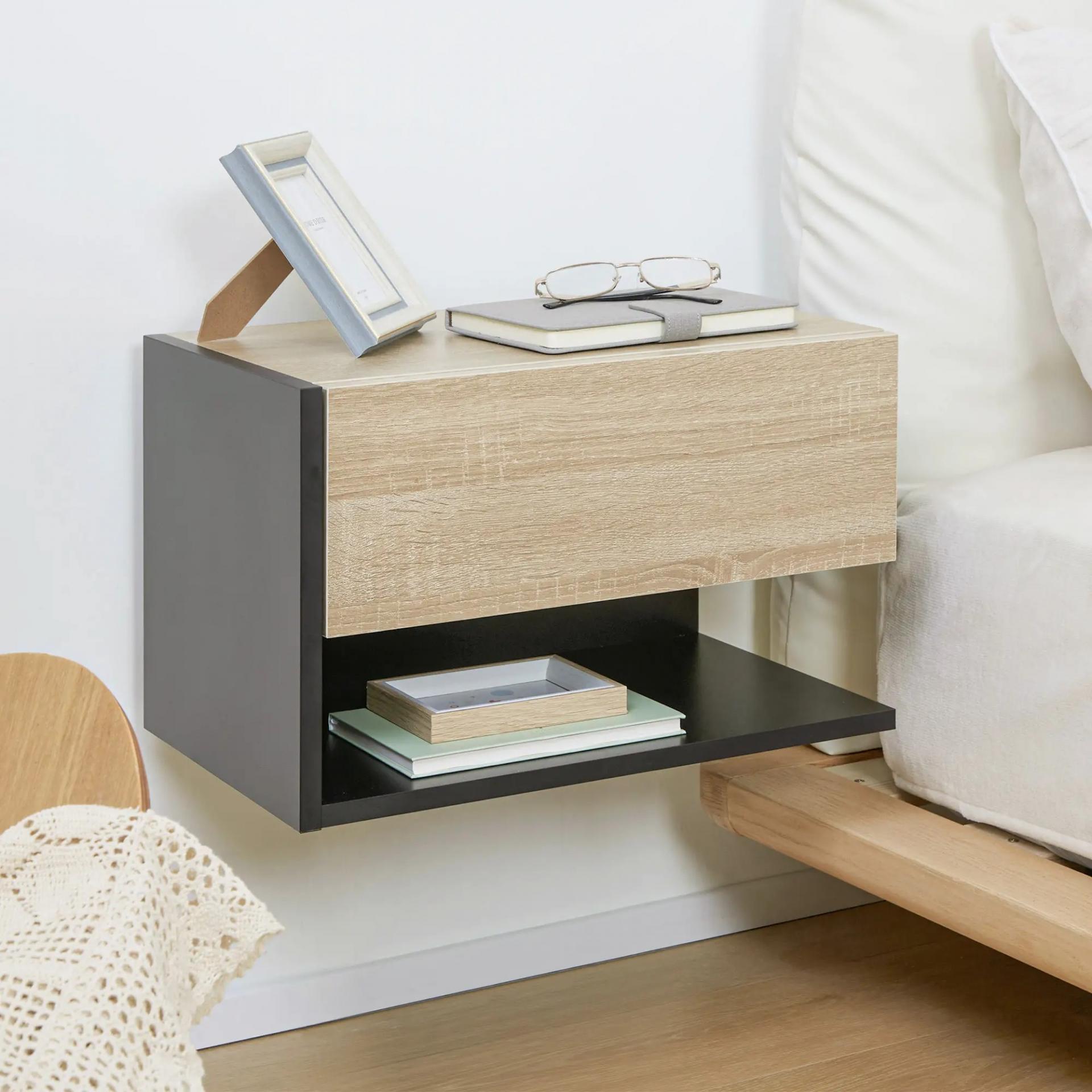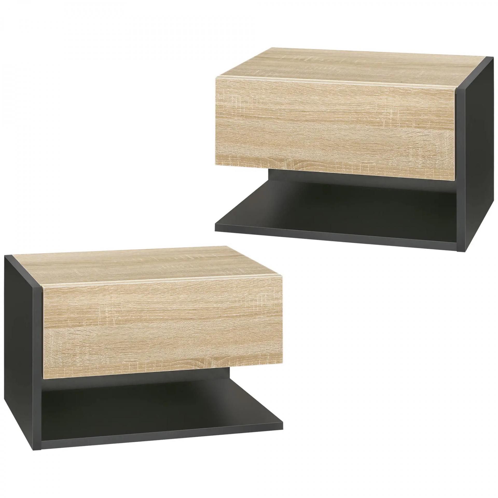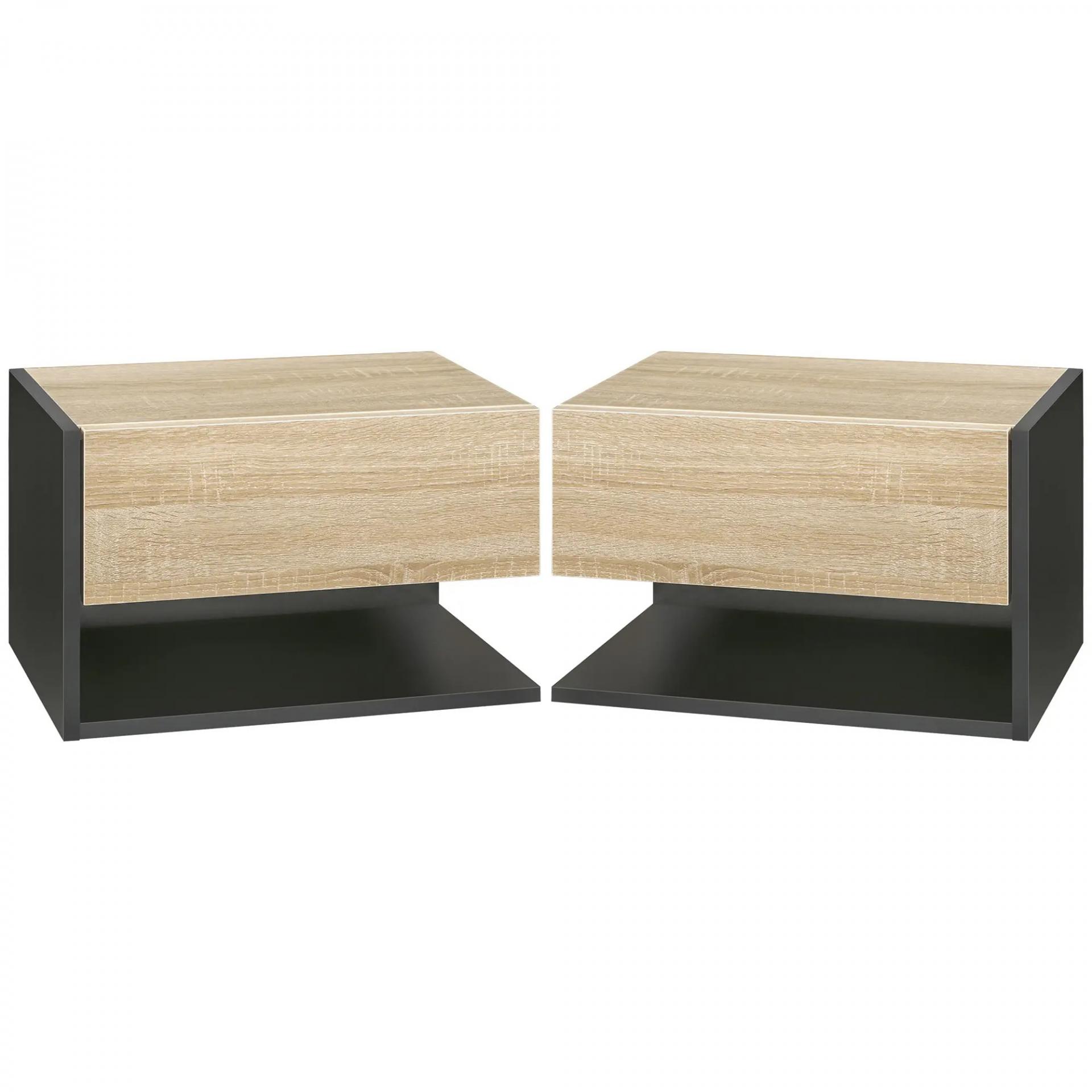 Juego de 2 Mesitas de Noche Flotantes Mesitas de Noche Colgantes con 1 Cajón y Estante Abierto 46x30x30cm Roble y Negro